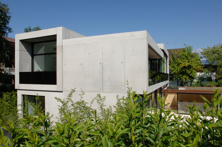 Der Betonbau, von außen wehrhaft und hart empfängt seine Besucher hinter der Eingangstür warm und herzlich. Durch den vorgelagerten Kupferquader, die eigentliche Tiefgarageneinfahrt, wird der private Außenbereich vom halböffentlichen Bereich getrennt und bietet gleichzeitig Sichtschutz.