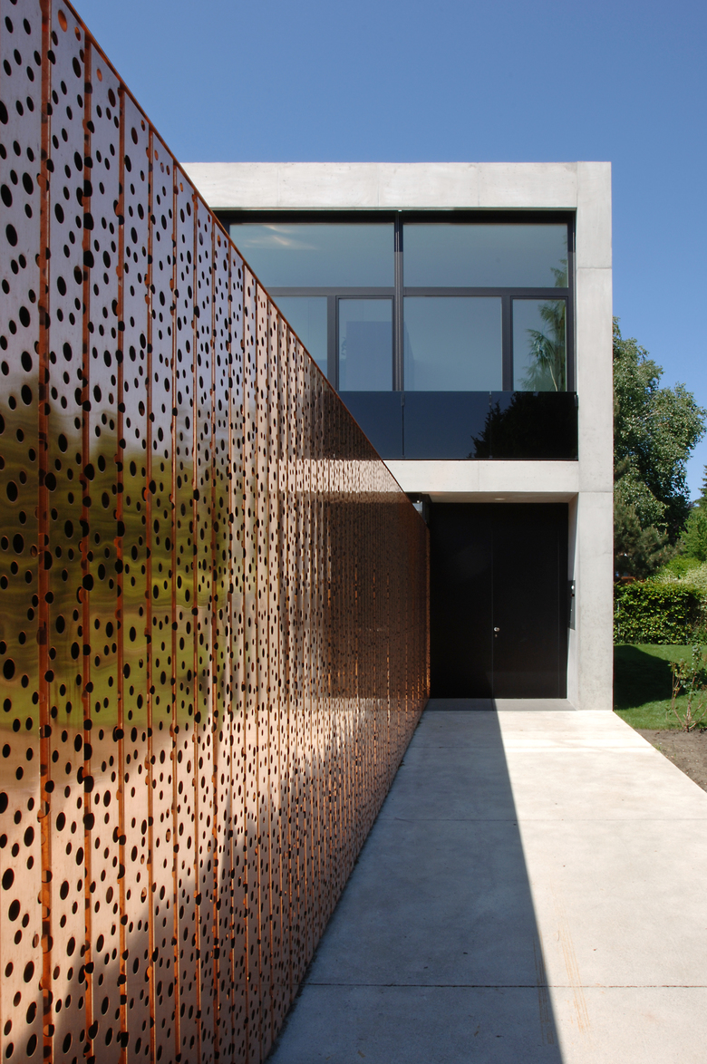 Die Materialisierung der Fassade bewirkt eine klare Differenzierung zwischen Haupt- und Nebengebäude. Die perforierte Kupferfassade der Tiefgarageneinfahrt sorgt für eine natürliche diffuse Belichtung am Tag und für eine interessante Lichtsituation während der Nacht. In ein paar Jahren wird die Kupferfassade eine grünliche Patina bekommen und somit einen schönen Kontrast zum Hauptgebäude bilden, welches in Sichtbeton mit schwarzen Fensterelementen gefertigt ist.
