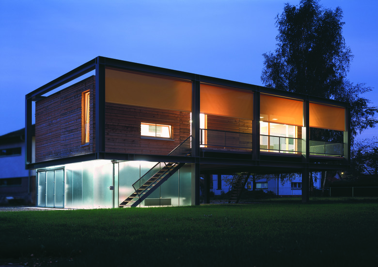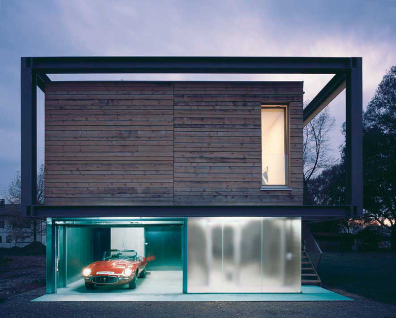 Das Wohngeschoss ist als Holzbox in die obere Eben geschoben. Darunter liegen, in einem deutliche kleineren Kubus, Garage und Nebenräume. Bereits von außen wird die Trennung in zwei unterschiedliche Funktionsbereiche durch die Wahl der Materialien deutlich gemacht. Die Fassade des Moduls, eine Holzrahmenkonstruktion aus vorgefertigten, wärmegedämmten Wandelementen, ist mit waagrechten leisten aus Weisstanne verschalt. Die Garagenbox erhielt hingegen eine transparente Haut aus satiniertem Glas.