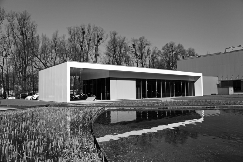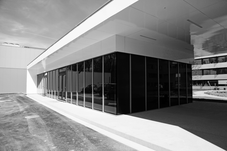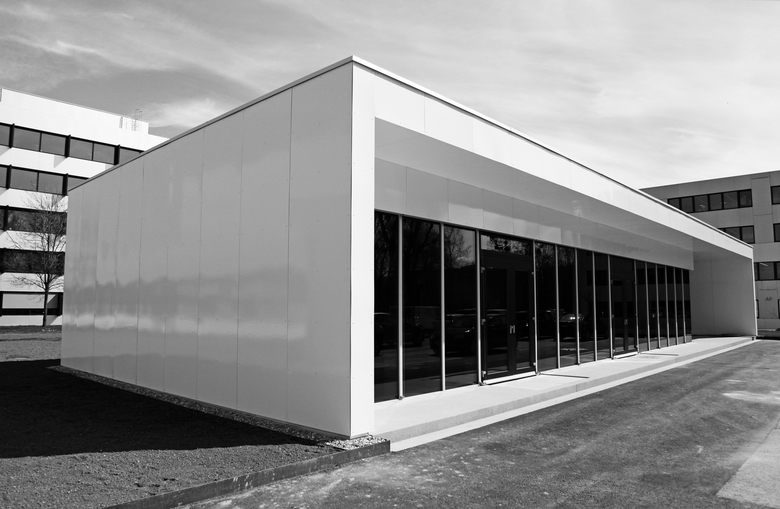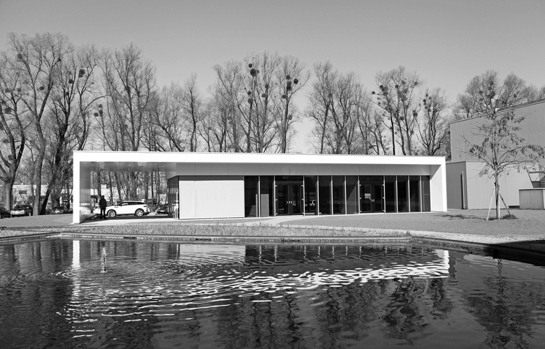 Der Wunsch der Firma Alpla, für die Mitarbeiter eine Aufenthaltsmöglichkeit zu schaffen, ging einher mit dem eines neuen Empfangs- und Präsentationsraumes. Es entstand in kürzester Zeit ein flexibler Pavillon in schlichter und eleganter Formensprache auf dem Innenhof des Betriebsgeländes in Hard. Im Zusammenspiel mit dem vor einigen Jahren angelegten Teich, trägt die neue Situation stark zur Aufwertung des Innenhofes bei. Durch die Glasfiberplattenfassade wirkt der Riegel in klarem Weiß wie selbstverständlich platziert.