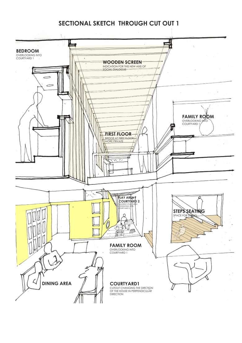 Two cut-outs are made to connect the private-upstairs and the public-downstairs, from which the brothers can overlook and engage into the dialogue of the house.
