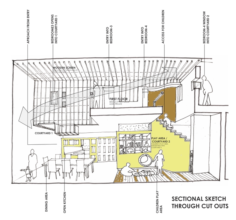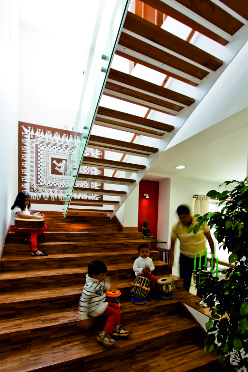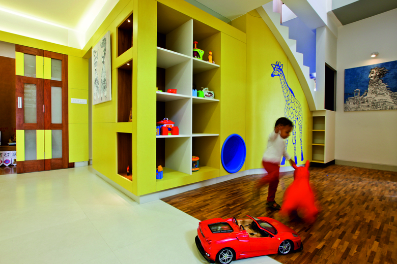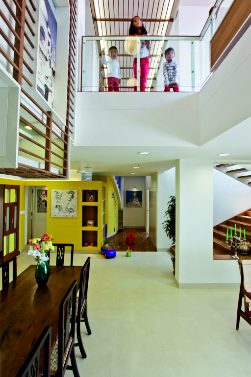 The main idea was the living, breathing and functioning of this family. The brother and their wives were given the upper level for its privacy and the parents and children were on the lower level with the dining, living and other areas. The children’s bedroom also served as a guest room. So they are tucked into individual bunk niches, which become their spaces in the house. From here, they access the upper level and the play area, all under their grandparent’s watchful eye.