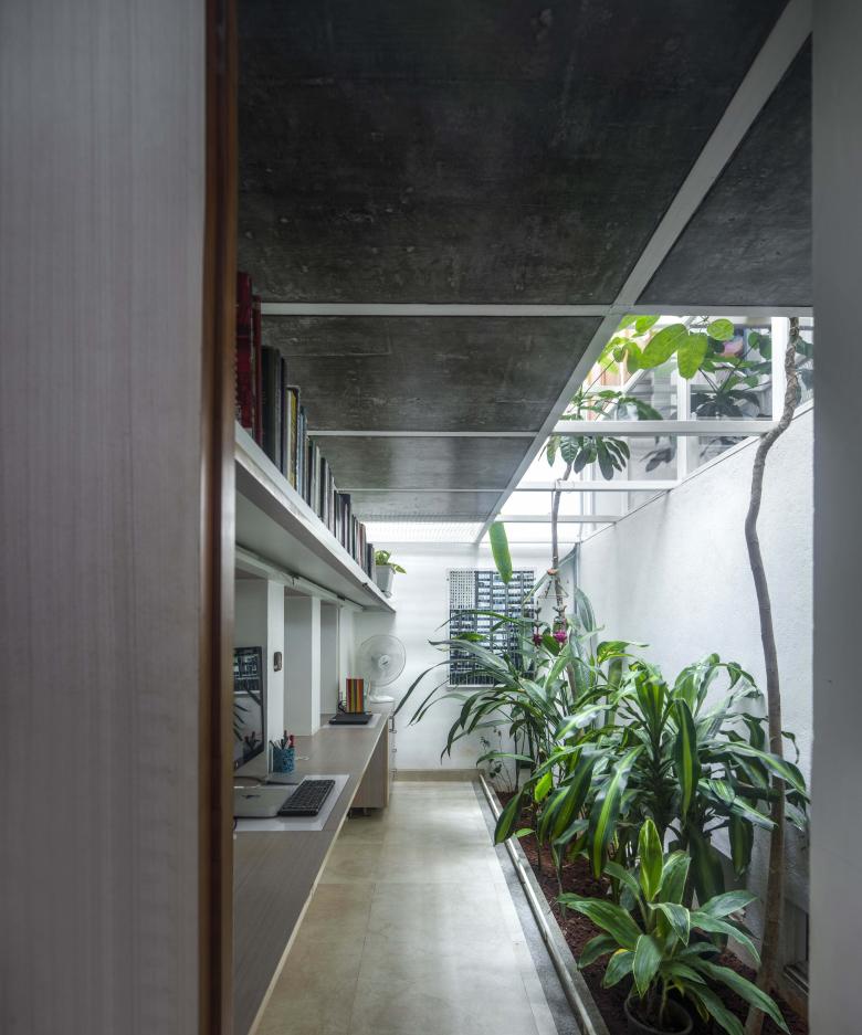 A light translucent sheet above the central core gets bright sunlight into both the houses, as it also enables cross ventilation for the peripheral spaces.