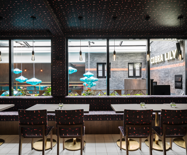 The design concept for Cobra Lily centred on the creation of a mysterious femme fatale. Cobra Lily became a journey through her day and night-time escapades, a myriad of places where she hangs out to meet people, solicit information or plan her next move. Teasing around this theme enabled the concept to take on different elements in different areas of the space but all with hints and allusions to the mysterious Cobra Lily. As the space is part heritage the integration into the existing envelope became paramount and the success of this design lies in clever use of the many nooks and crannies. In this way, the diners' experience emulates her daily journey as you go from bar, to restaurant or even to the bathroom you come across different design elements and features which peak your curiosity and draw you further into her world.