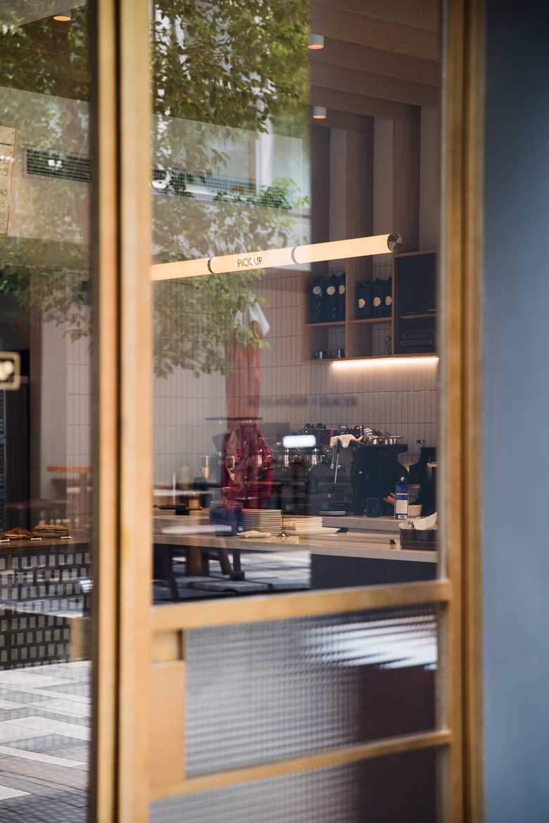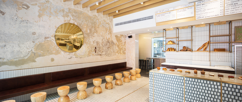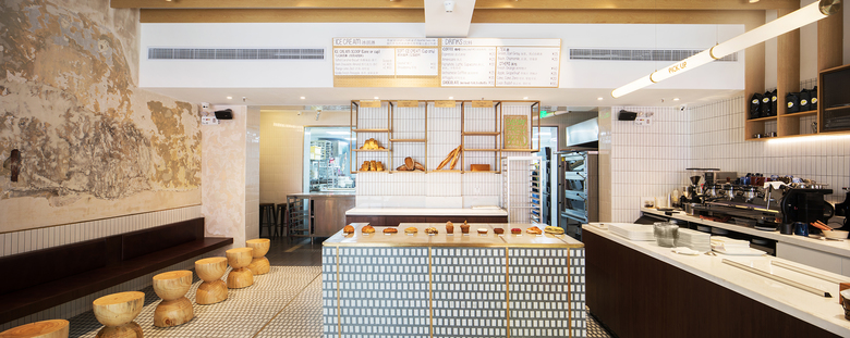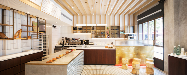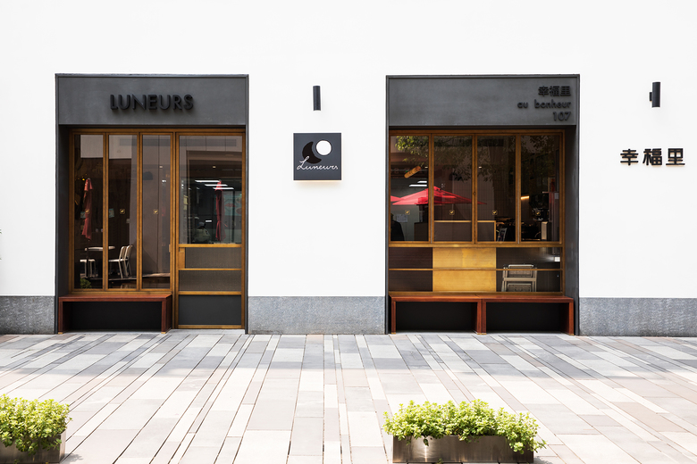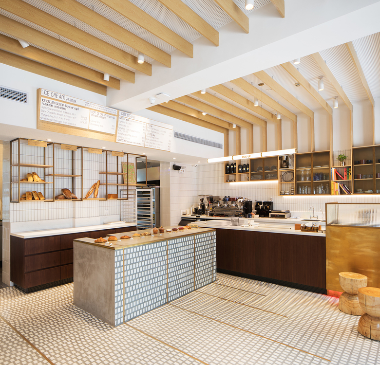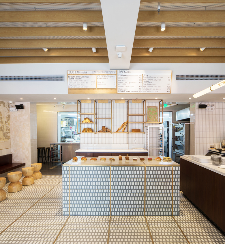 Luneurs Boulanger + Glacier is situated in a busy little walking street in the Former French Concession, Shanghai. This French-run neighbourhood store consists of an onsite working bakery and front retail space. Views through to the back-working space allow for the customer to visually interact with the baking process. The front shop space is intimate and compact, combining traditional rustic elements with sleek modern surfaces. The presentation of the baked goodies, combine a more traditional display at the back with a minimalistic "hero product" display on the counter.
