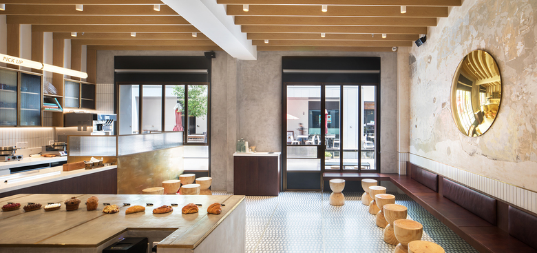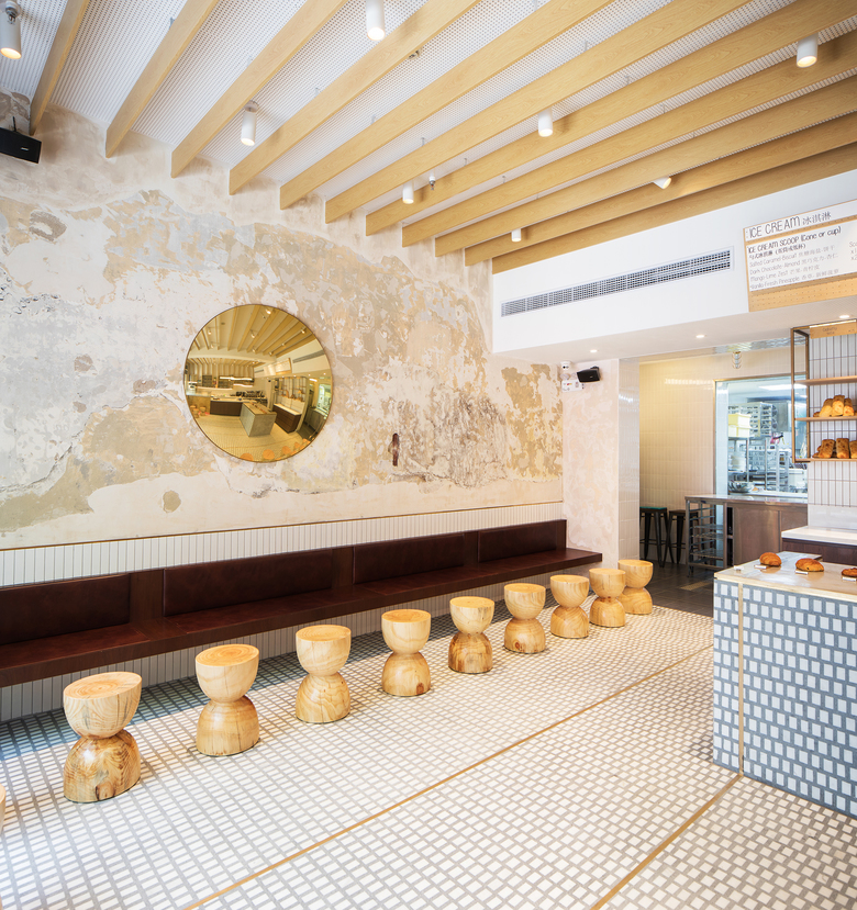 Gold highlights, including a large gold convex mirror on the wall reference Luneur/the moon and bring an upmarket touch to the interior. Clean lines and distressed textures feature on the walls, floor and ceiling. The terrazzo floor, inlaid with brass strips, continue these lines, hand-laid piece by piece over a number of days. This attention to detail within the design is also reflected in the passion and quality in the craft of the ice cream and baked product。
