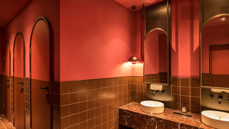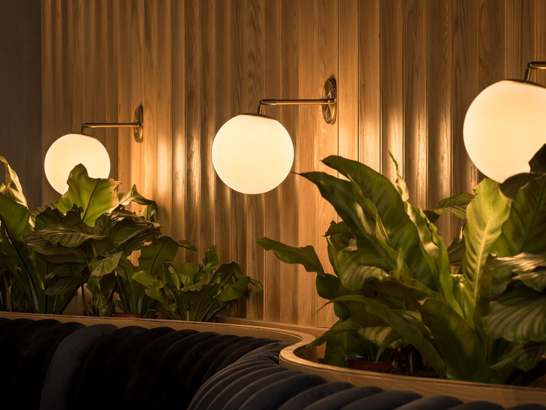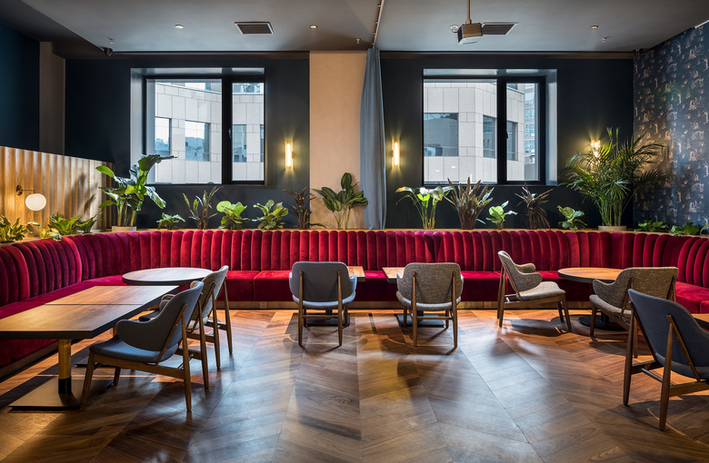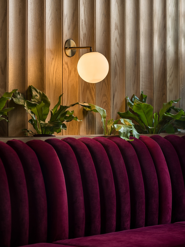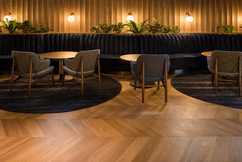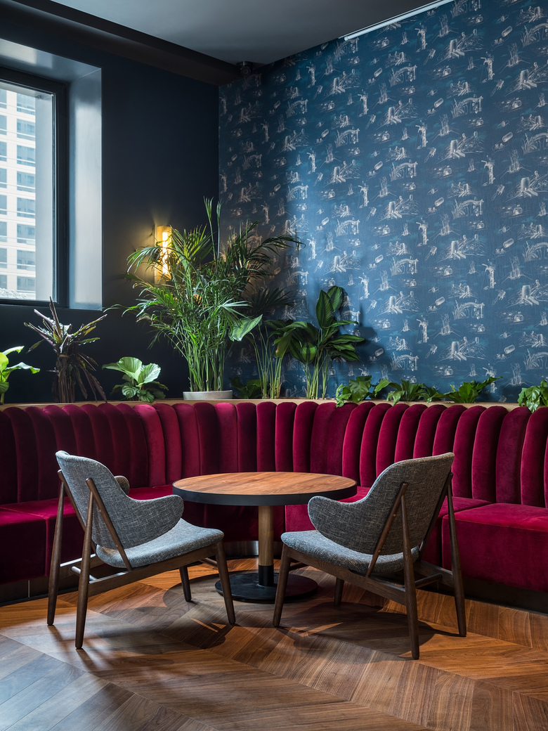 For the second level mezzanine lounge the designers wanted to create a more intimate space that overlooks the beer hall and forms a separate VIP area. To distinguish from the more traditional tiles in the rest of the space, the designers chose to use a mix of Oak and Walnut in chevron for the floor. A more refined touch is introduced into the space using a curved dark blue and deep red velvet bench seating. The custom-printed silk wallpaper and wall-mounted globe lights create an intimate lounge space.