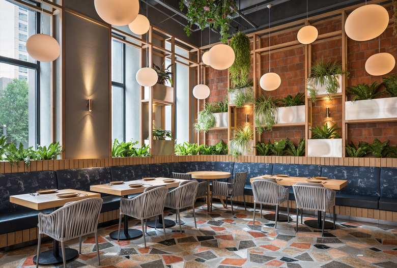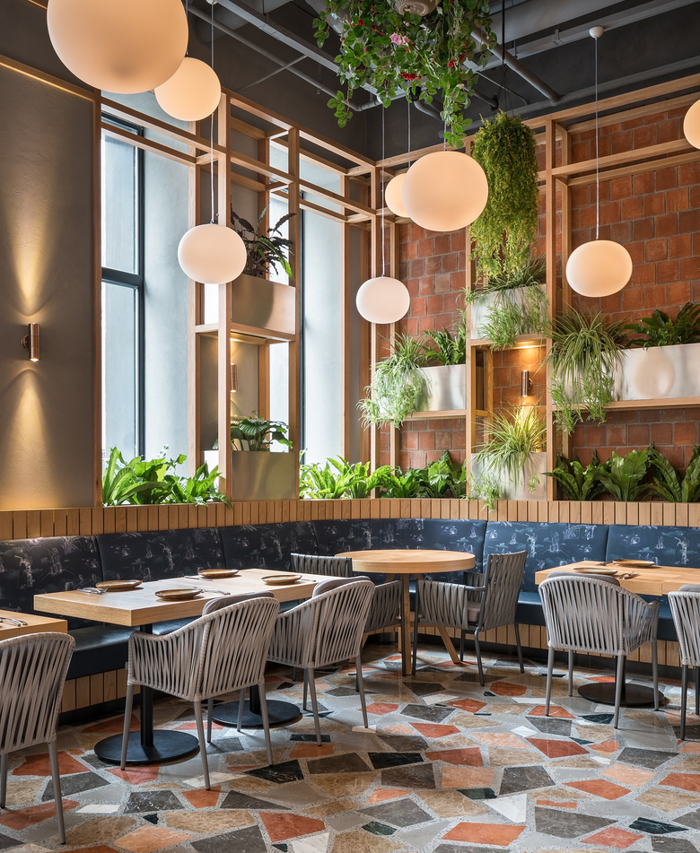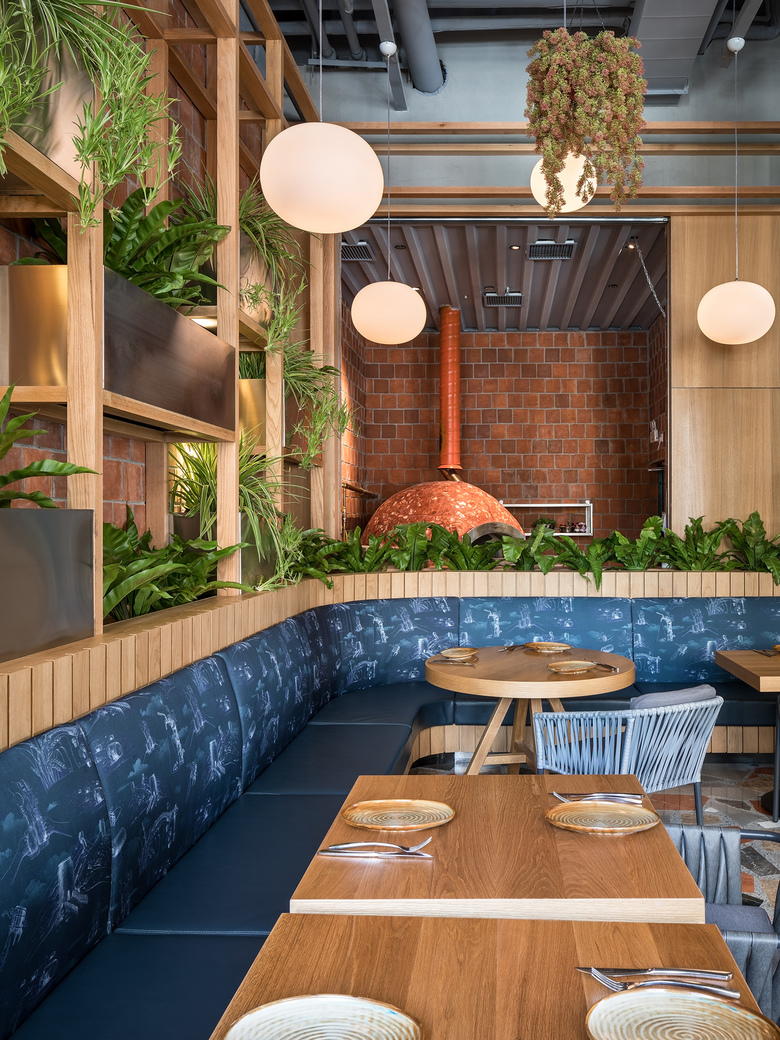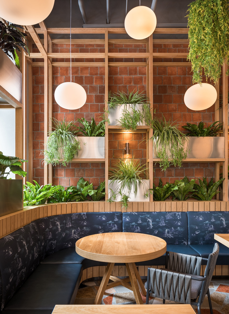 On the exterior, the large font lettering of “Oh Yeah Brewing” stamps the façade, a crisp stainless-steel box contrasted against the earthy beige textured finish. Hannah Churchill, the design director of hcreates, really enjoys this aspect of the space. “You enter the brewery through this silvery box and are instantly transported away from the concrete grey of the urban surroundings into a flourishing garden oasis”. The designers carefully selected different elements such as the Terracotta tiling, concrete plastered walls, earthy-coloured large-format terrazzo flooring and hanging plants, to create a calming yet grand space in natural tones. The far end of the garden features a beautiful terracotta pizza oven, where wooden oak frames conceal stainless steel planter boxes, surrounding the seating and bringing more greenery to the space. Floor-to-ceiling windows flood the space with natural light. Custom-printed blue fabrics were created to add extra subtle detailing to the bench seats and to compliment the more traditional outdoor garden-styled furniture.