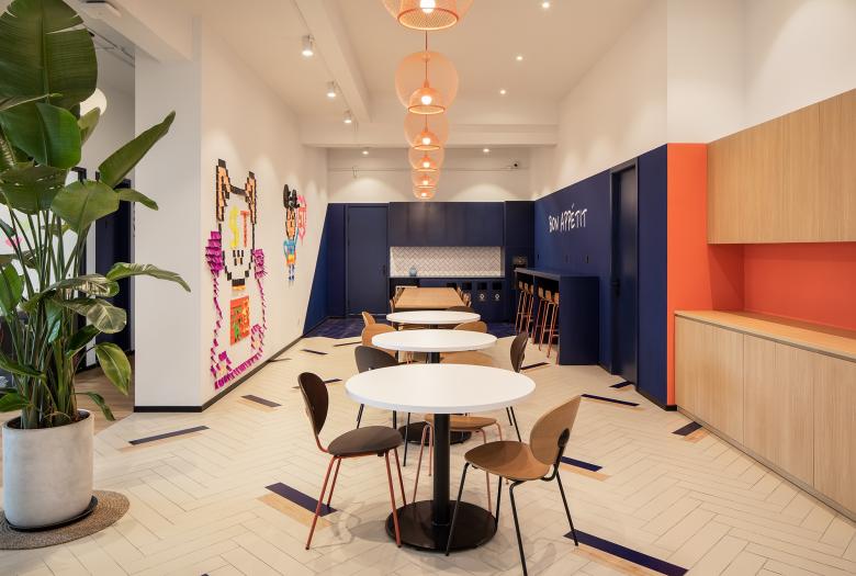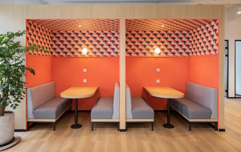 To maximise cost vs quality ratio, hcreates focused on using off-the-shelf, cost-efficient materials and detailing without sacrificing impact and quality. Clean white walls and easily maintained oak wood flooring contrasted against simple, but effective painted colour pops within the office and meeting rooms.