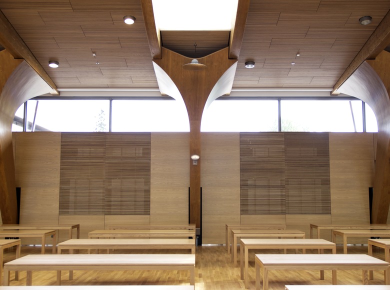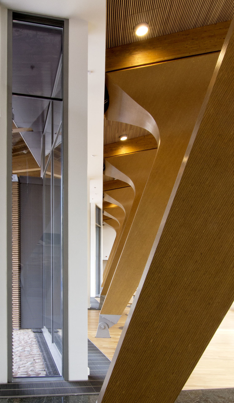 When the building was already in use, it appeared that there was a need for an auditorium bigger than the original one. Its design started in early 2015. The site had scanty area for additional building, but the solution was found in a broad fan-shaped room with sloping floor. The structures are mainly wood. The roof consists of stressed skin panels supported by one glulam principal beam and exterior walls. The wooden battening of the exterior cladding joins the facade to the function room of the main building that was completed earlier.