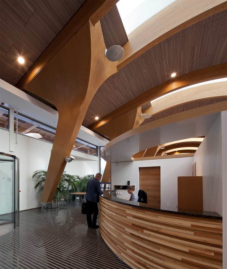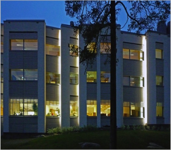 Tapiola is traditionally marked by a humane dialogue between architecture and nature. As an abstract metaphor of a birch forest, the facades of the new building were articulated by vertical sections bent in varying angles. This produces many variations in the interiors, spatial rhythms and views opening towards the sea.
