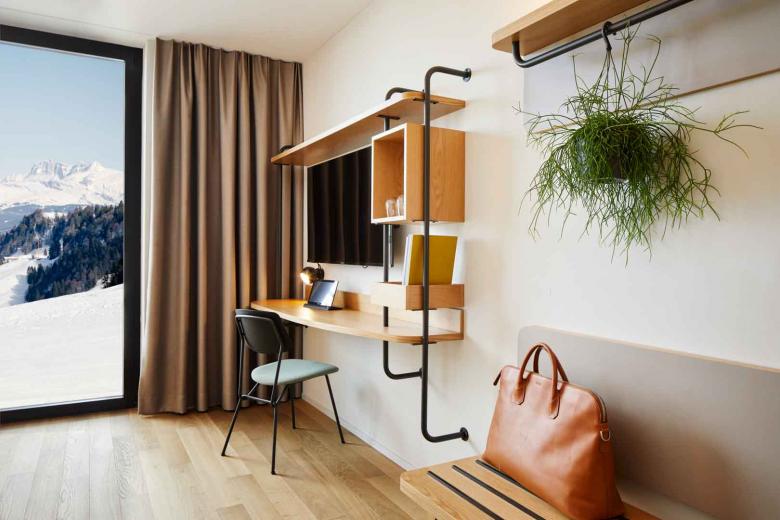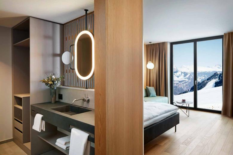 Der Neubau der Stoos Lodge (G&A Architekten AG, Altdorf) mit 101 Zimmern und Suiten und grosszügigen Gastronomie-, Kinderspiel-, Kita-, Gym- und Seminarraumflächen steht an der Kopfstation der Standseilbahn Stoos.