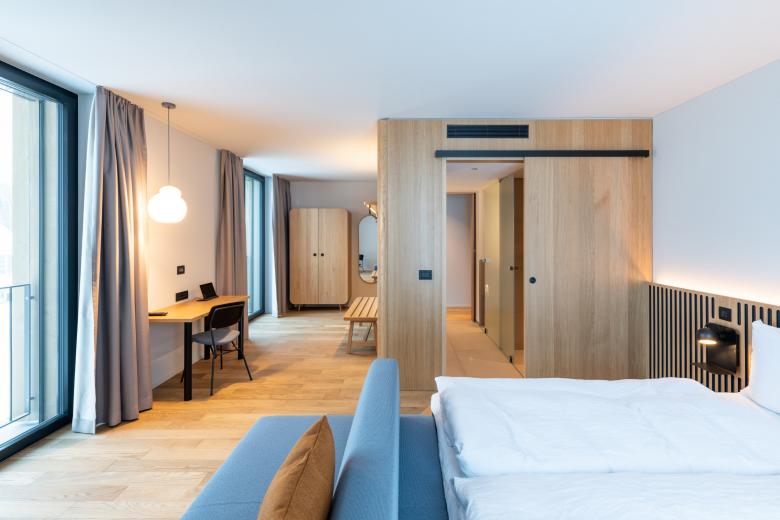Ziel unserer Innenarchitektur ist es, eine lifestylische, urbane und warme Atmosphäre zu schaffen, die sich von den üblichen pseudotraditionellen Klischees der Mountain Lodges absetzt.