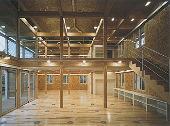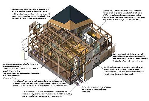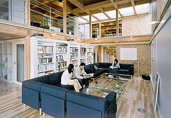 In this building, "space" is created for satisfying any combination of factors which characterizes each scene of creative intellectual activities, and structured to provide smooth transitions to each scene insuring to provide the scenes and characteristics of a living environment. The method of structural construction and interior environmental design were planned to establish a standardized building system. For this purpose, "lapped-joint beam system" was devised. To maximize use of natural energy, the air conditioning system that can switch the flow of air depending on the outdoor temperature and interior heating condition was adopted. These architectural factors are designed as "skelton" and for the "infill", a knockdown integrated furniture system was designed, which accept change over to newer and more advanced IT equipment.
