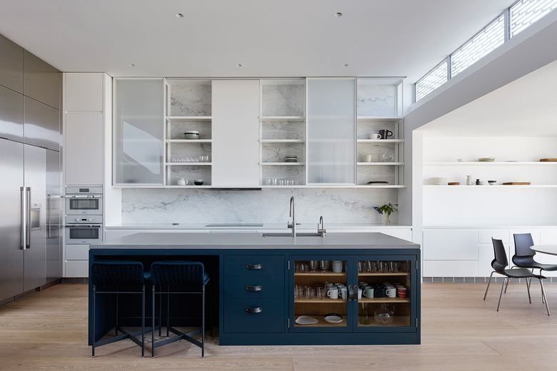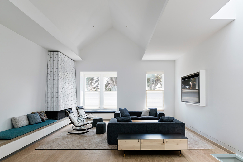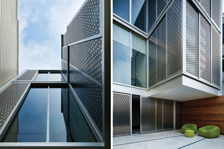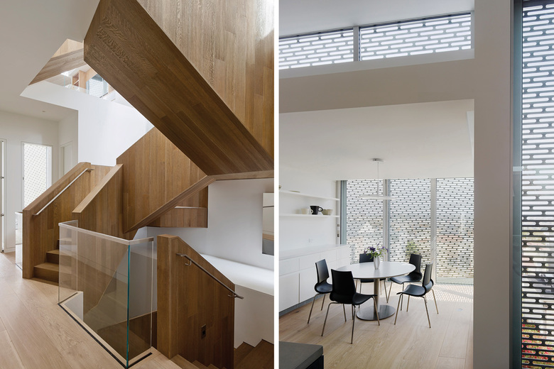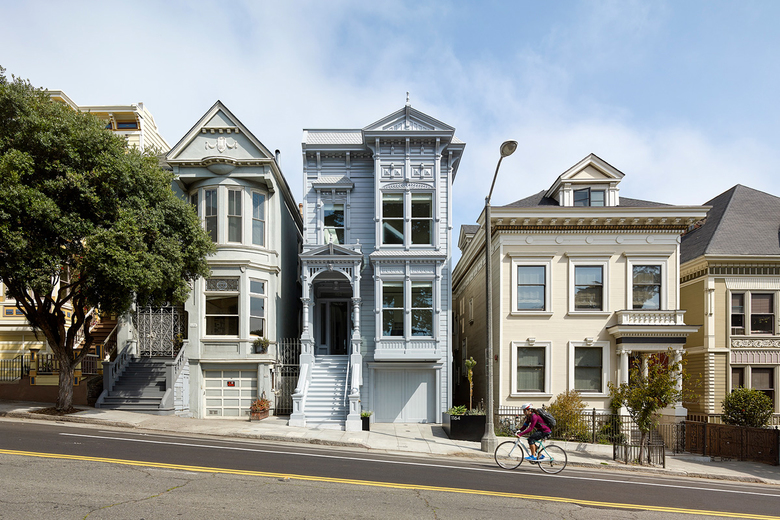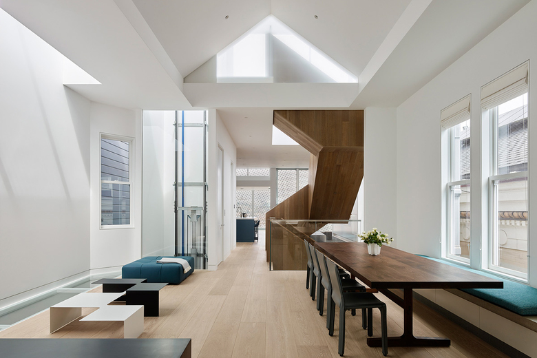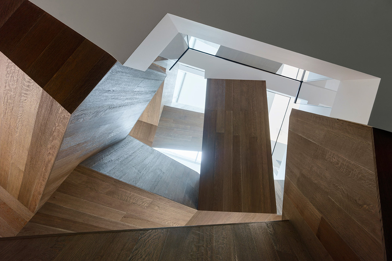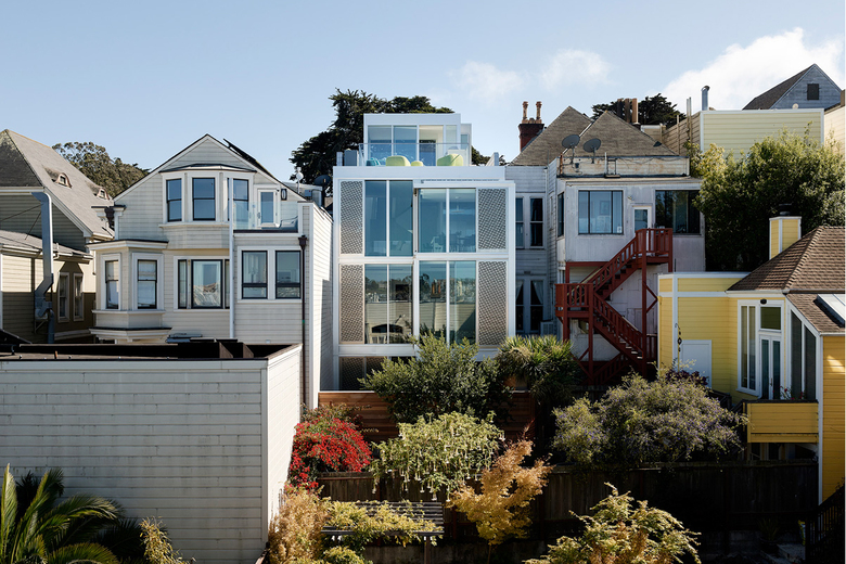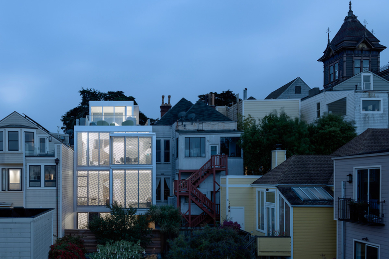Fronting Alamo Square Park, a historic landmark within San Francisco, this three-story residence is a house with two faces. From the street, the original 1889 facade was faithfully restored, and appears to have been dipped in a modern bath of silver paint, hinting at the transformation within. The rear façade reveals the building’s new identity in a multi-layered composition of sliding aluminum screens and glass. Upon entering, the house has been punctured with light from above and is organized around a sculptural staircase. The form of the stair is a twisted volume, alternating wood-clad solids with light-filled voids. The stair culminates at the roof with sweeping views that connect back to the historic city and the Bay beyond.