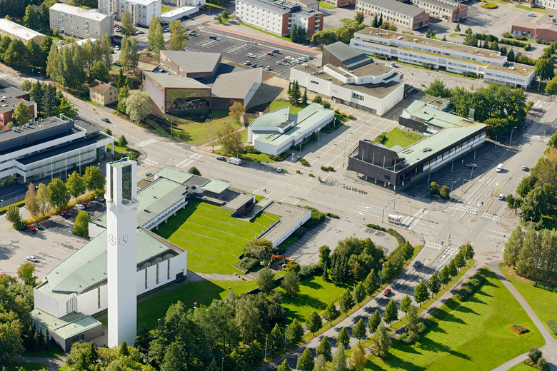 Dividing the new building into three sculpture-like sections was an important insight that helped to reconcile its large volume with the scale of the Aalto centre. The new library thus relates to its surroundings. On the other hand, it discreetly keeps distance from the outlines and materials of the old civic centre. The dark copper of the facades stands out from the whiteness of the surrounding Aalto buildings.