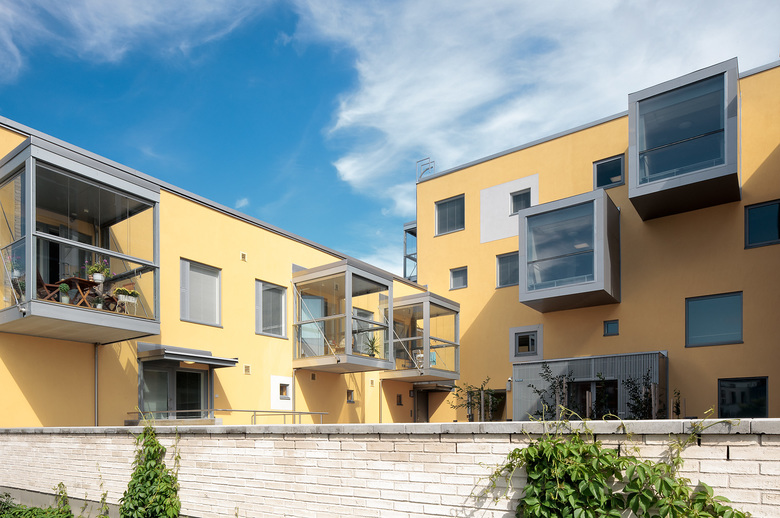 The longer building façades are made of light brick. The courtyard facades are plastered in yellow. The street-side yards present a more urban atmosphere while the park-side yards open to the nature. The four-floor high building adapts to the park and the housing area on the other side of Agronominkatu. The two-floor high service part supports the scale and identity of the church hall.