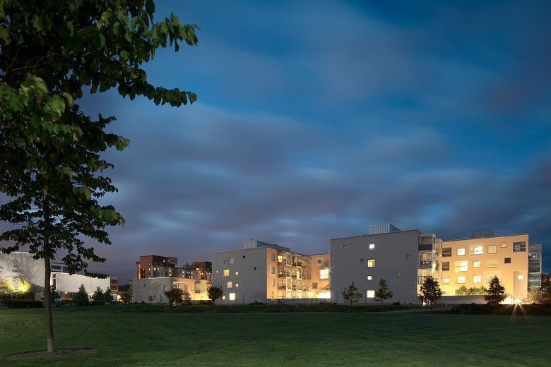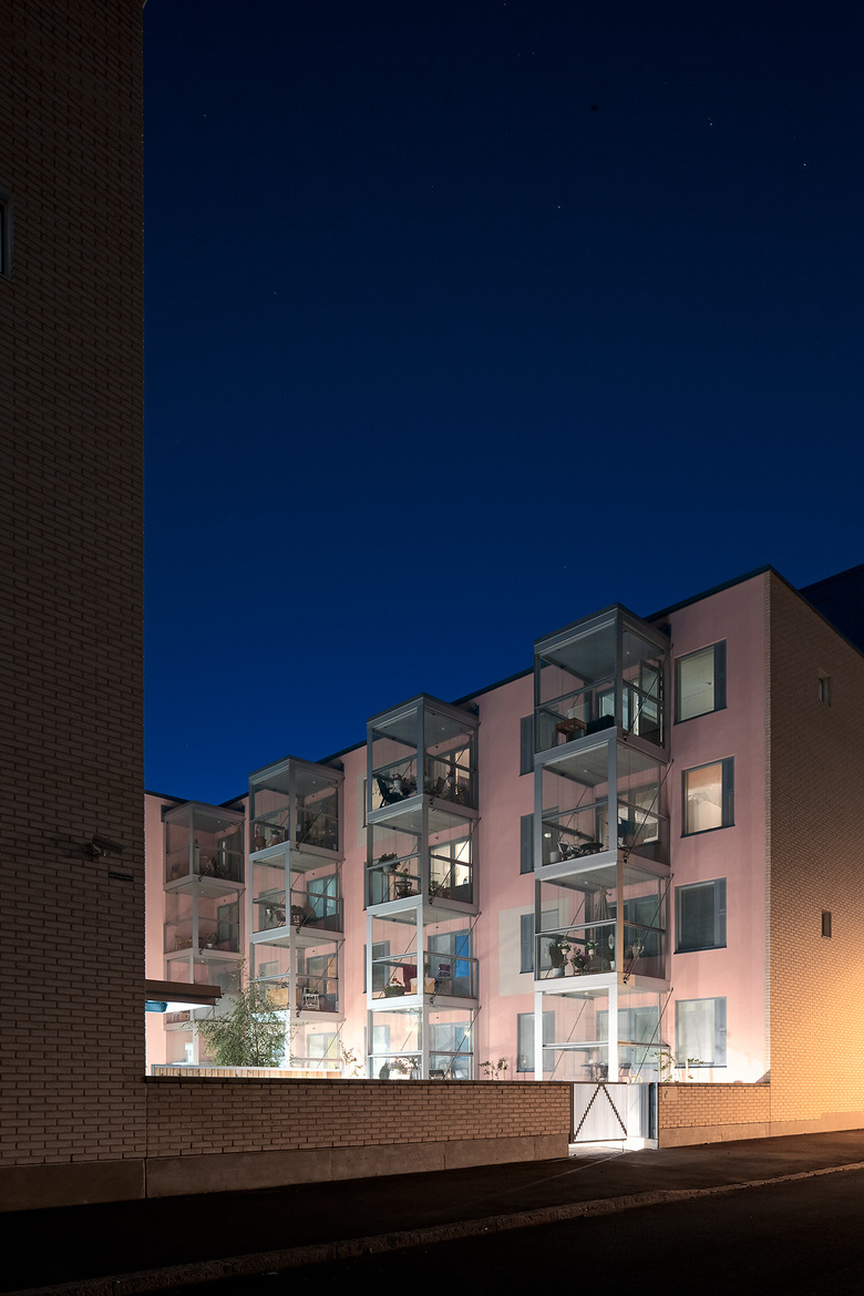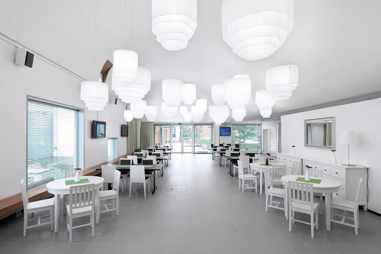 The Viikki Housing for Elderly building has 122 residential apartments and two 18-apartment group homes. The common areas and services are located next to the main entrance. There is also a large living room for the inhabitants and a 50-person restaurant space.