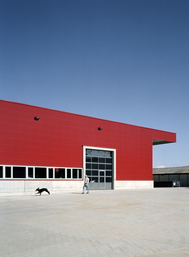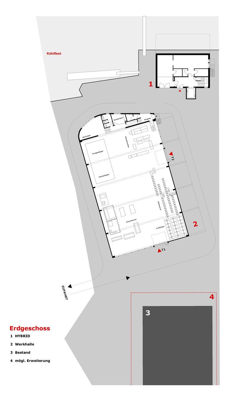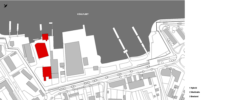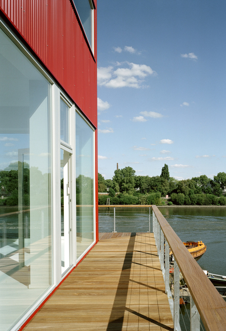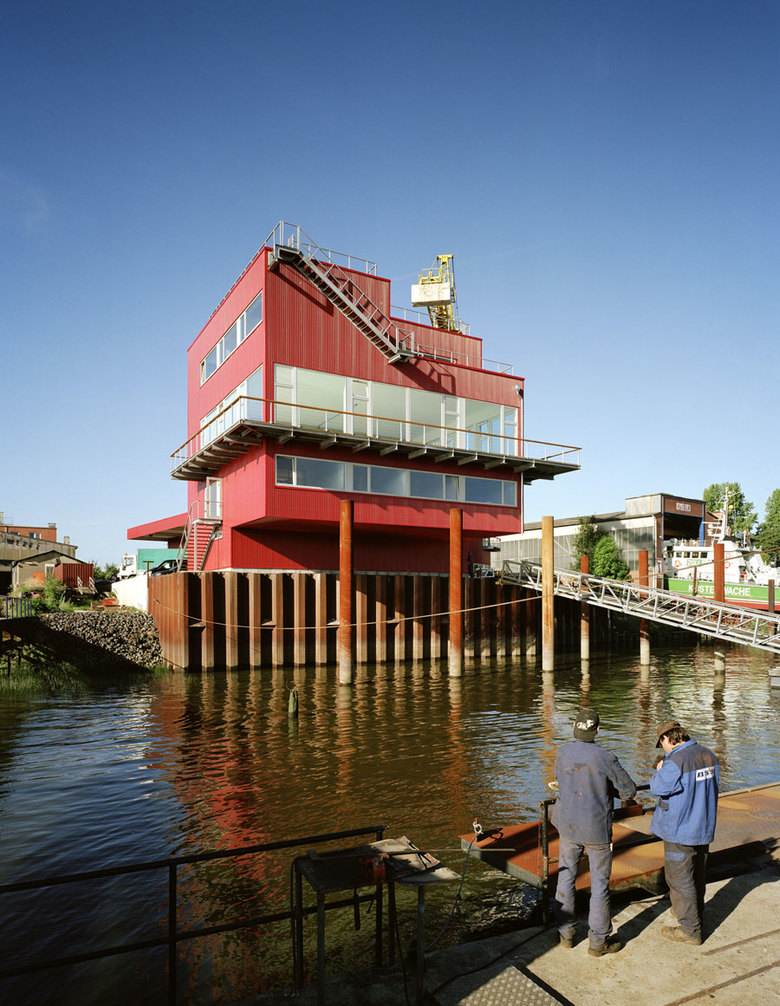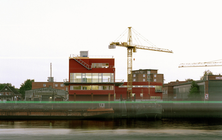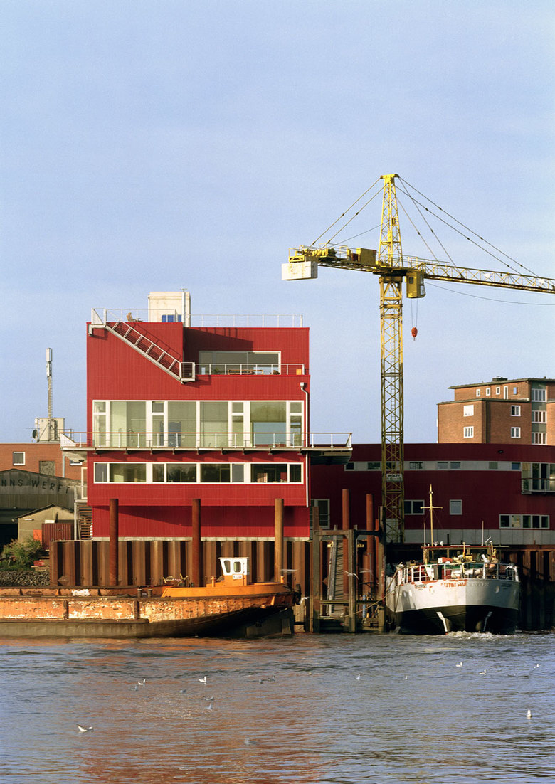 Das Umfeld ist noch immer von industrieller Charakteristik; alte, mit Ziegel ausgefachte Werfthallen prägen die Umgebung. Die einheitliche Verkleidung beider Neubauten mit signalrotem Trapezblech nimmt dies auf; ihre augenfällige Besonderheit bleibt so mit dem Allgemeinen verbunden.