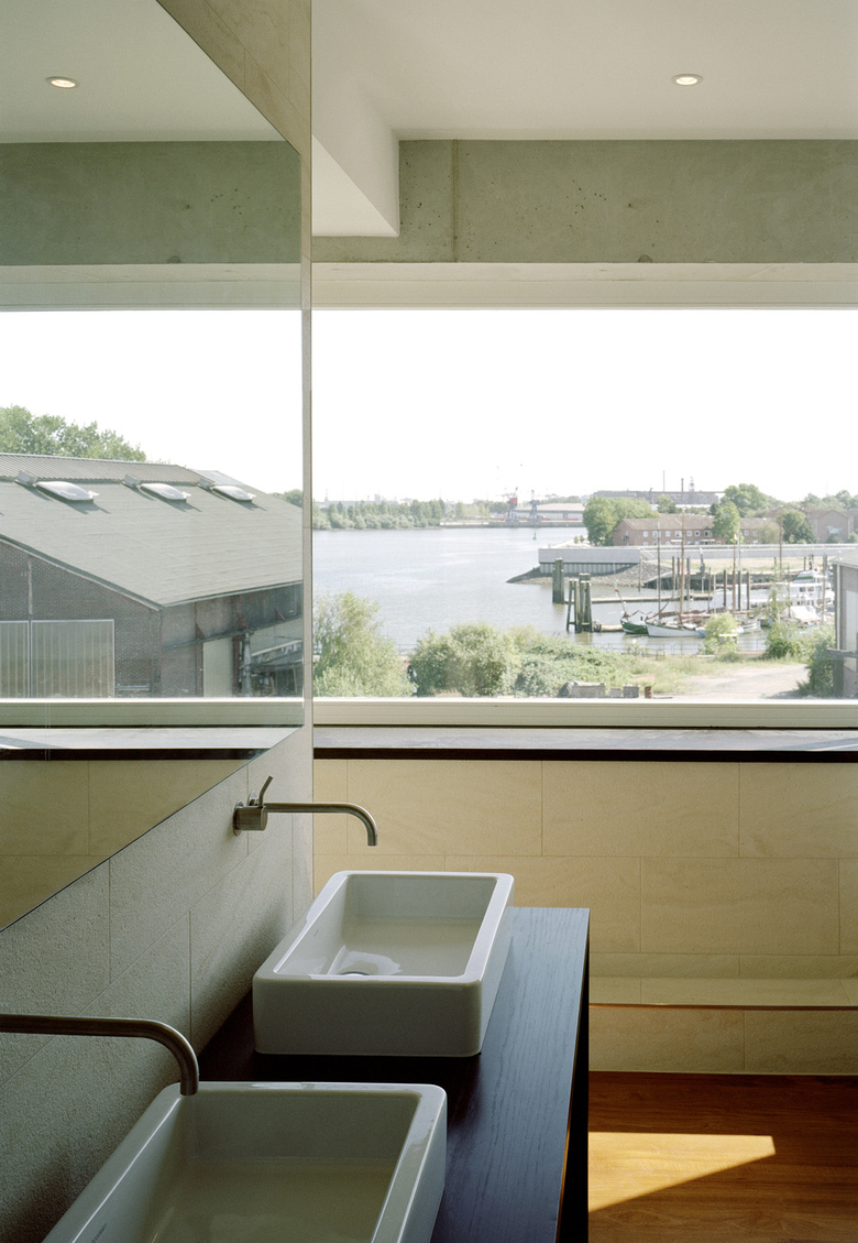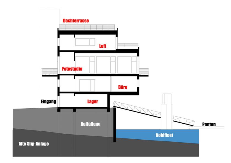 Der schroff aufragende, betonierte Aufzugsturm des Hybrids bildet das Rückgrat des kubischen Baukörpers; Büros, Studio und Wohnung können sich nach drei Seiten dem Wasser zuwenden. Den Höhepunkt der räumlichen Inszenierung bildet das darüber gelegene Fotostudio, das weit über den Fleet kragt. Riesige Glasflächen gewähren einen atemberaubenden Panoramablick, nach Norden bis zur Elbchaussee.