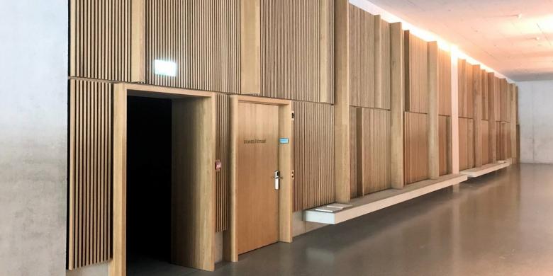 They are located in the 20.5 cm thick lightweight walls of the seminar rooms on the first and second floors, which have been designed to a particularly high standard. These partition walls feature vertical wooden slats of solid oak on the outside, into which the transfer slits are inconspicuously integrated. To achieve this, Kiefer manufactured transfer grilles with an extra-long "neck", to bridge the width of the wall to the corridor side.