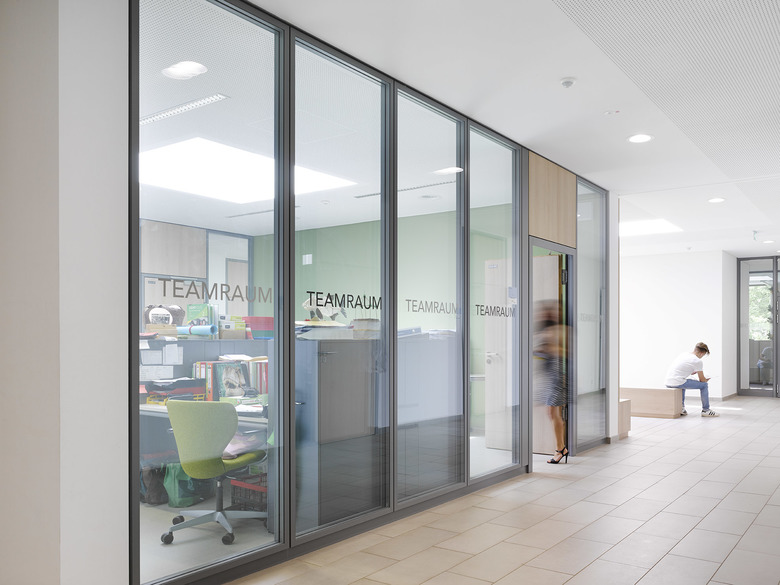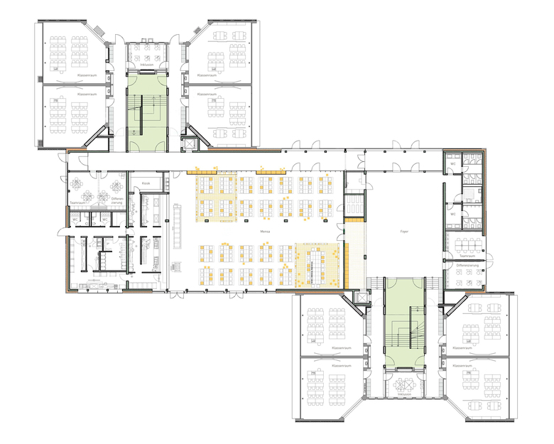 The functional order of the school is based on the special educational concept of the 4th comprehensive school. Each of the two tower houses houses rooms for teachers and classes in each of its two floors, which form so-called "teams". The teams are differentiated by rooms in different color. At the heart of the teams are the team squares - large glazed rooms where the teachers work and where they are available for the students at all time, which offers the greatest possible transparency. Sitting as well as learning islands in the hallways support this common learning atmosphere and create a high quality of stay.