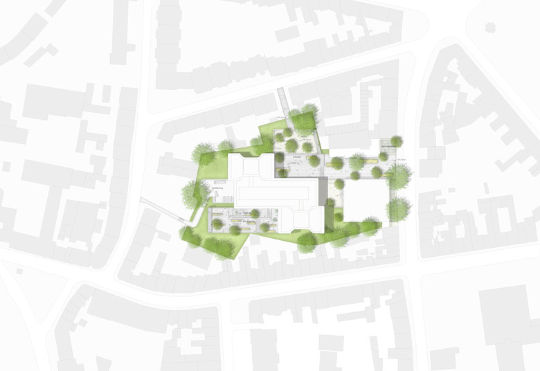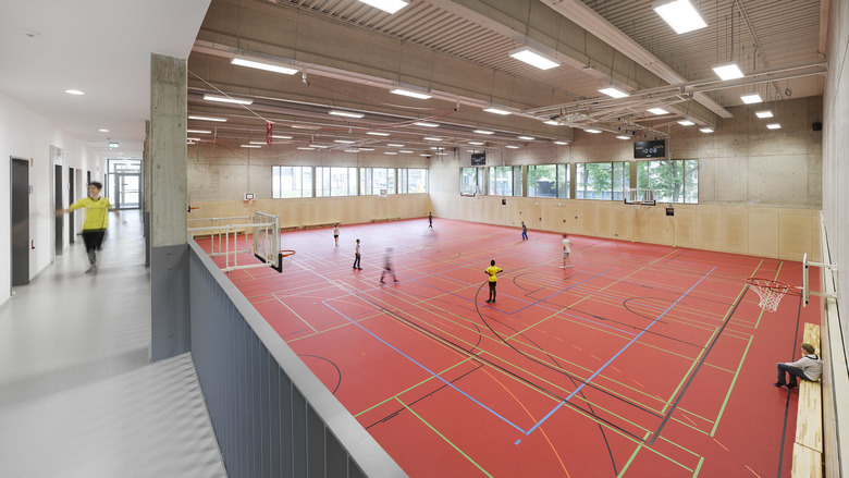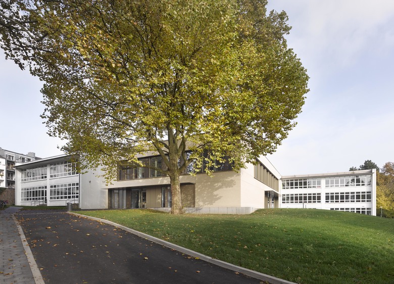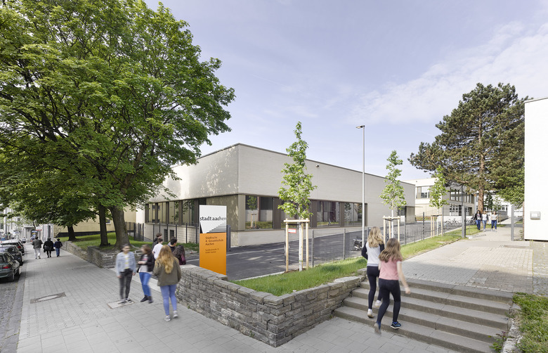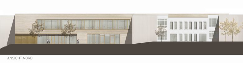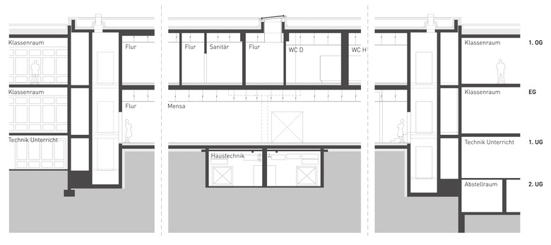 The two existing buildings - the "tower houses" - remain on the site. The new building, which is placed between them, not only completes the overall urban concept, but also represents the functional link. The new construction of the sports hall also deliberately fits into the building sequence and supports access to the school complex.