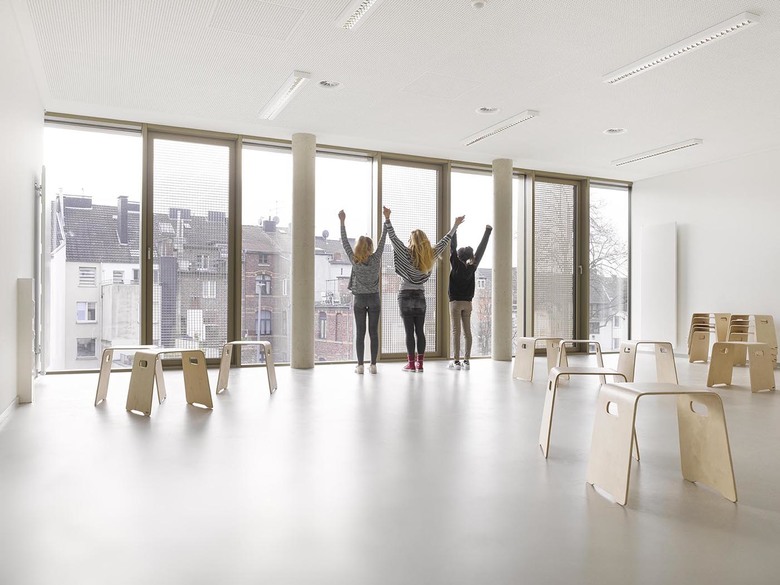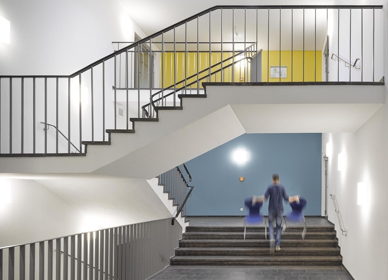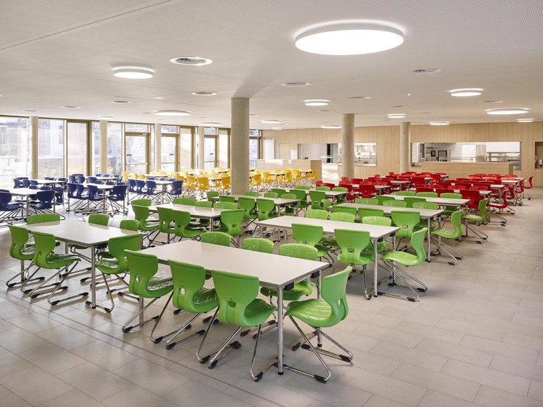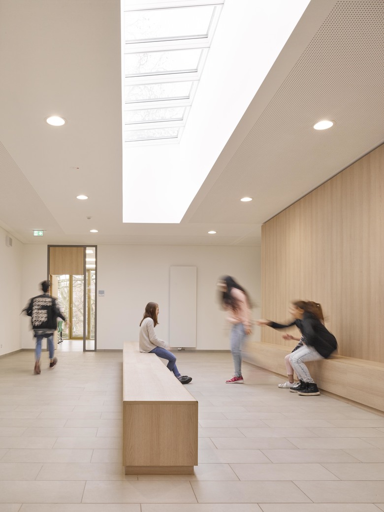The jointly used areas in the new building of the foyer, cafeteria and dining rooms are communication areas for the entire ensemble. Large glass surfaces allow the connection of interior and exterior space and continue the bright and positive learning atmosphere in the new building.