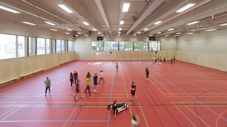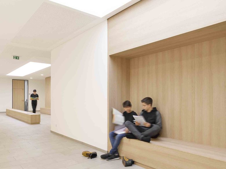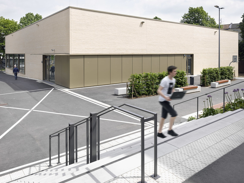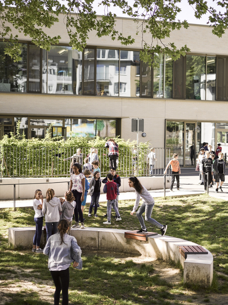 Together with the open spaces of the entrance forecourt and the dining hall, a compact, full facade is created using a light brick façade. Complemented and framed by trees and green areas, it becomes a learning island in the green of the city.