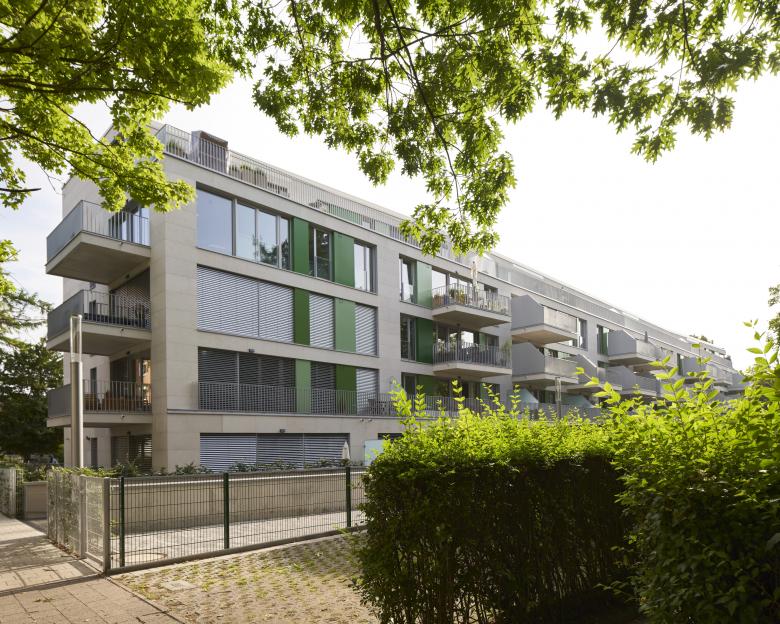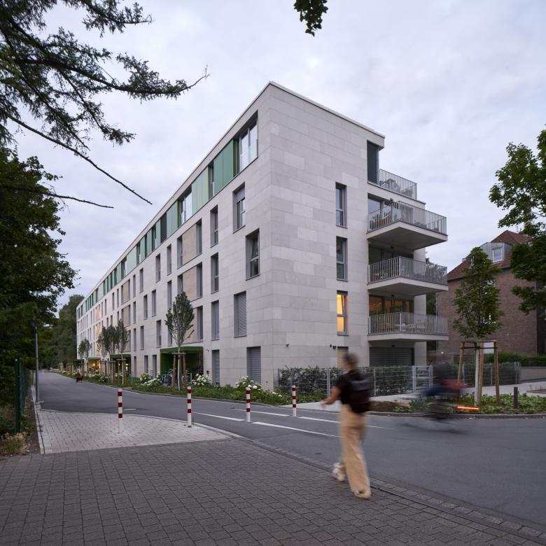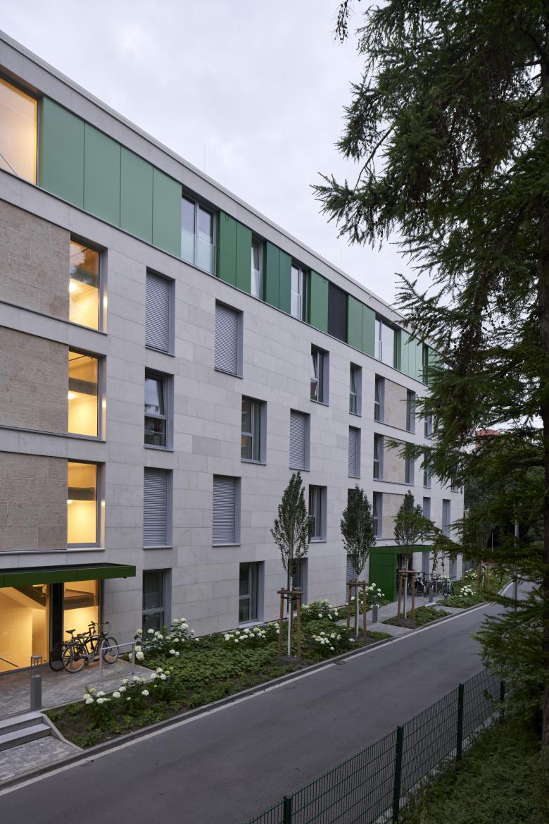 Der Gebäuderiegel mit der hochwertigen Natursteinfassade erstreckt sich über 5 Ober- und ein Untergeschoss und beherbergt 44 Eigentumswohnungen.