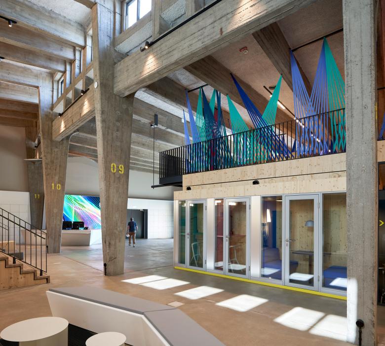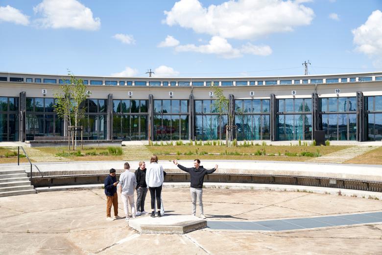 Das Ensemble ist in drei ebenerdige Baukörper gegliedert, die als großräumige Hallen kreissegmentartig angeordnet sind. In dem kathedralartig ausgebildeten Mittelbau befindet sich das 2geschossige Innovatorium, das öffentliche Veranstaltungen für 400 Personen erlaubt. Ähnlich wie einst die Dampflokomotiven wurden pro Segment in dem höheren Hallenteil 2geschossige Holz-Raummodule in freiem Spiel eingeschoben bzw. eingestellt. Der niedrigere Hallenteil erhält vereinzelt eingeschossige Module und behält damit seien hallenartigen Charakter als Raumkontinuum. Alle Raummodule sind in BIM als elementierte Massivholzkonstruktion ausgeführt.