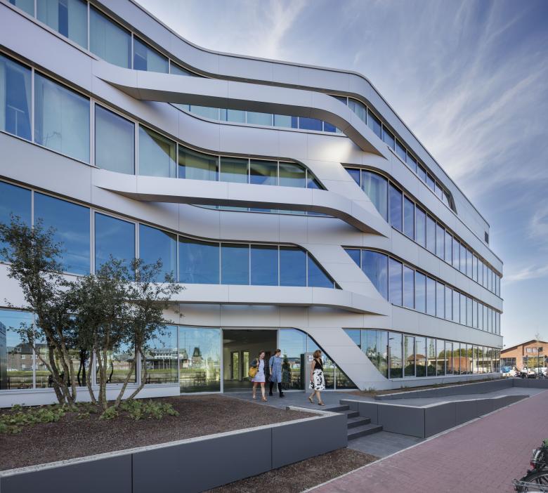 Der Umriss des Gebäudes weist keine rechten Winkel auf, nur runde Ecken. Die hinterlüftete Leichtmetallfassade mit Dreifachverglasung ist zunächst durch eine Bänderung horizontal gegliedert. Die strenge Horizontale wird aber durch schräg verlaufende Fassadenbänder und auskragende Fassadenelemente aufgebrochen. Durch die Metallstruktur gemeinsam mit den vielen Glasflächen erscheint das Gebäude sehr grafisch.