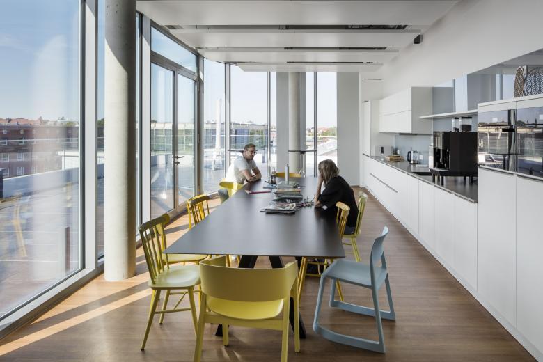 In die modernen, hellen Büroräume ist eine Kommunikationsagentur eingezogen, zwei Etagen hat eine Softwareentwickler angemietet, im Erdgeschoss werden temporär mietbare Co Working Spaces angeboten. Im Staffelgeschoss befinden sich neben Meeting places und einer großen Küchen- und Aufenthaltszone auch ein weitläufiger Konferenzbereich. Umgeben ist der raumhoch verglaste Bereich von einer großzügigen Dachterrasse mit südwestlicher Ausrichtung. Je nach Wetterlage kann man die Arbeitsbereiche nach draußen verlagern – mit Blick über Rheine, der zweitgrößten Stadt des Münsterlandes.