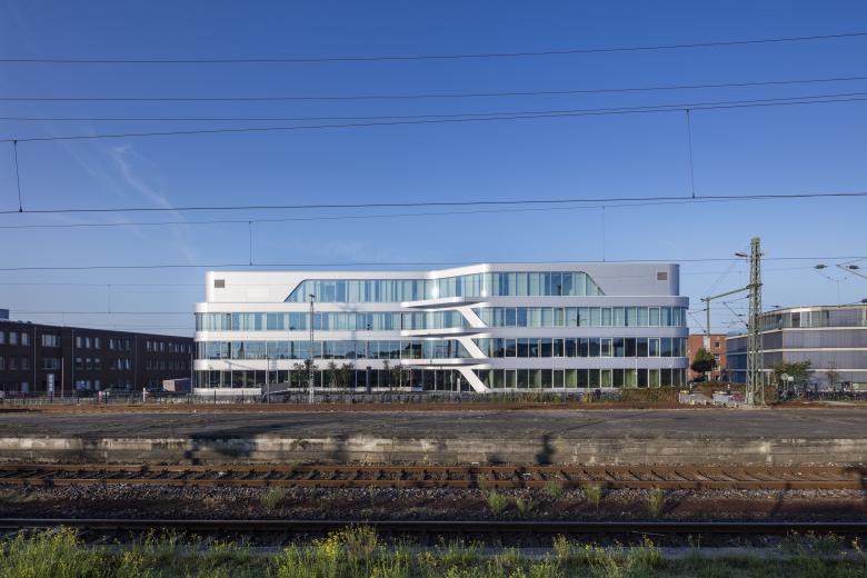 Der Neubau nimmt mit seiner länglichen Form und den abgewinkelten Seiten die städtebaulichen Fluchtkanten auf – allen voran den Verlauf der Bahntrasse – und schafft durch den Versatz im Gebäude einen architektonischen Bezug zum bereits 2013 errichteten Franz-Tacke-Haus.