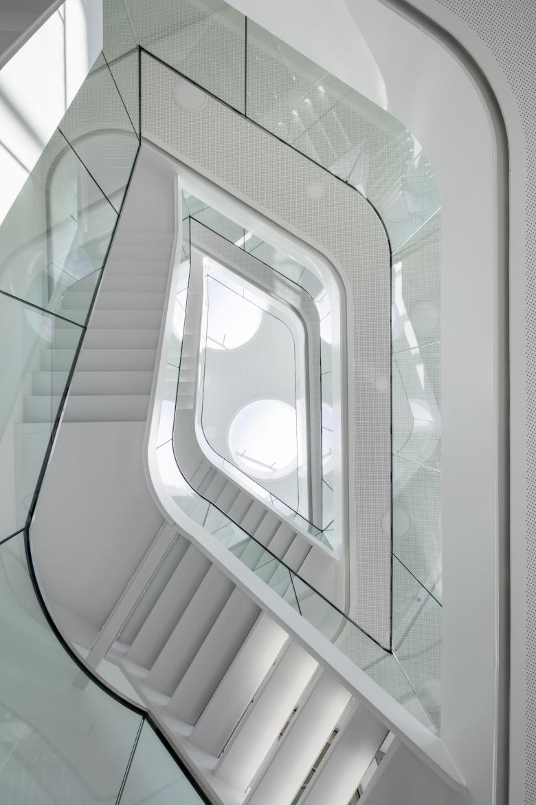 Auch im Inneren, besonders im begrünten Atrium, das sich über alle 4 Geschosse erstreckt, und durch das ein großzügiges Treppenhaus führt, erscheint das Haus mit seinen vielen Aus- und Durchblicken sehr hell und transparent.