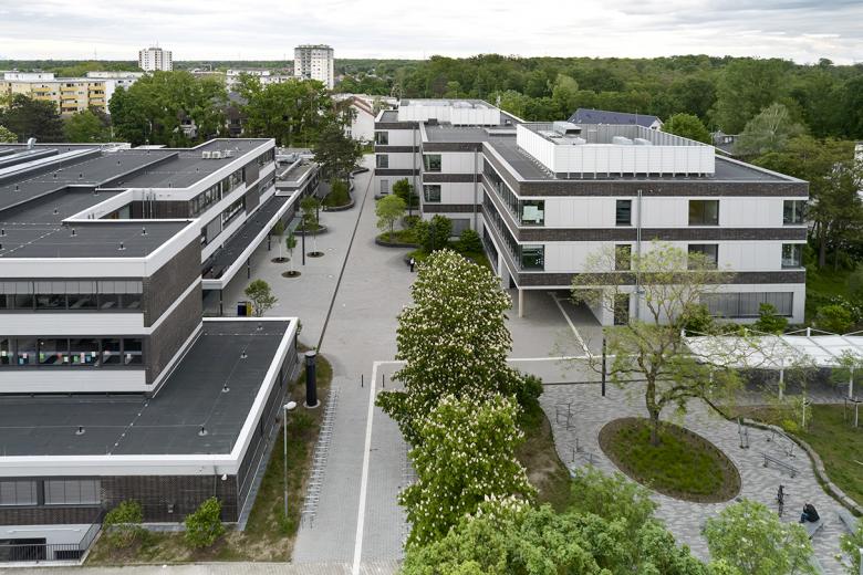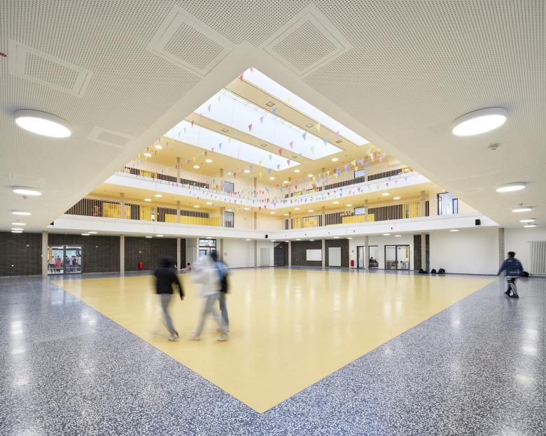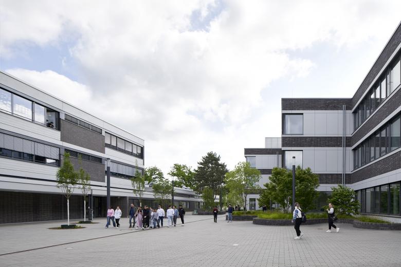 Zwischen den beiden Schulgebäuden und der bestehenden Sporthalle ist ein zentraler Innenhof entstanden, der als Schulcampus oder pädagogischer Außenbereich genutzt werden kann.