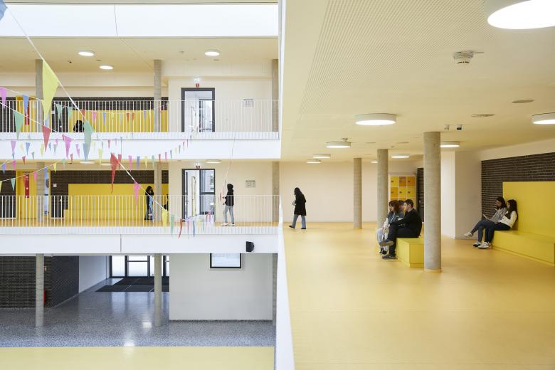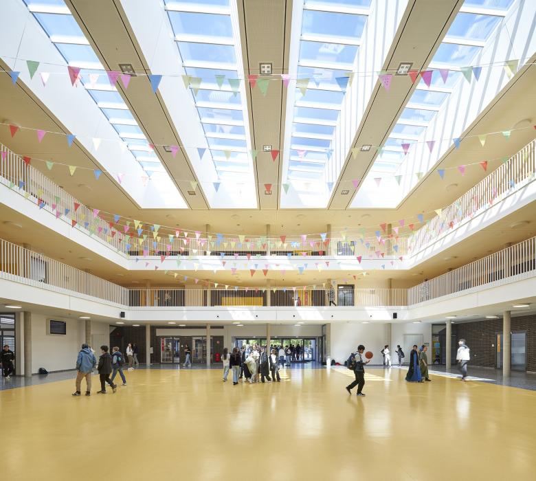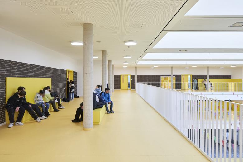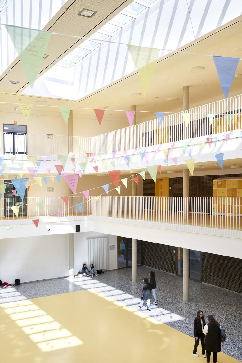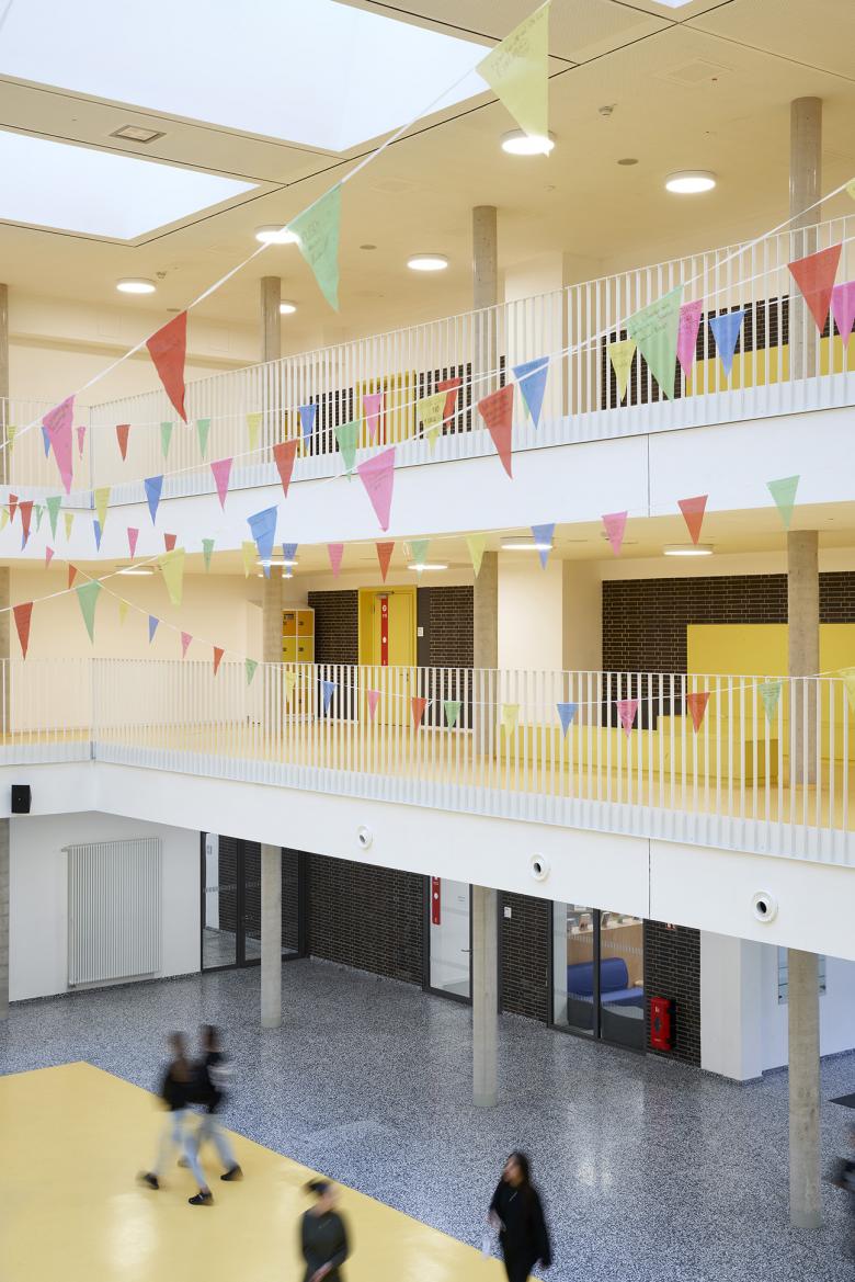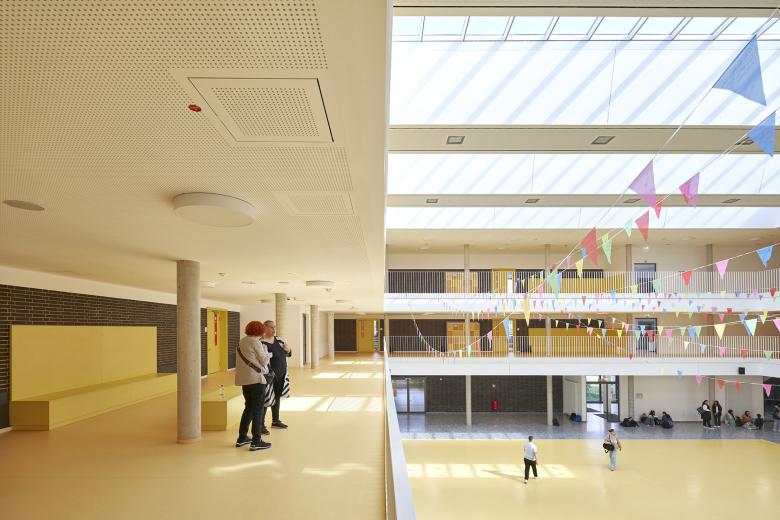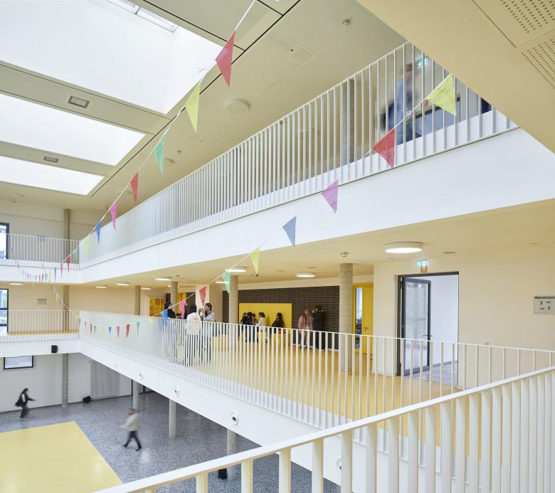 Es wurden großen Wert auf die barrierefreie Erschließung aller Räume gelegt, auf ein gesundes Klima in den Klassenräumen und ausreichend natürlichen Lichteinfall. Freuen können sich die Schülerinnen und Schüler auch über zusätzliche Rückzugsorte und Arbeitsplätze neben den üblichen Klassenräumen: Die Galerie rund um das Atrium bietet multifunktional nutzbare Flächen.