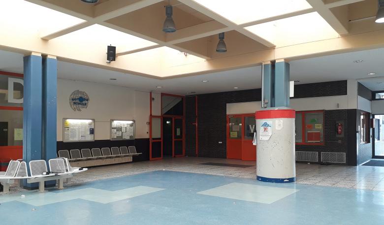 Nun wurde zum Schuljahr 2023/24 auch das Hauptgebäude saniert und neu organisiert. Neben den Klassen 8 bis 10 sind hier Musik- und Theaterräume untergebracht. Das Herzstück ist die offene Aula, die durch die Anhebung der Dachkonstruktion bis über das zweite Obergeschoss sowie durch das Einbringen umlaufender Galerien neu entstanden ist. Hier sind nun schulinterne Veranstaltungen bei perfekter Akustik möglich.