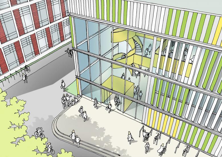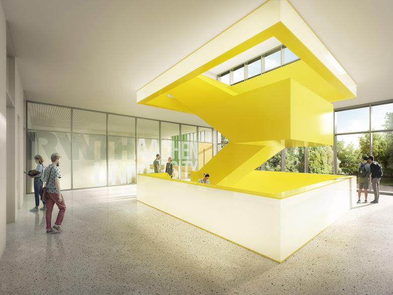 Laborbau ist bei KRESINGS Schwerpunktthema. So wird nun auch in Aachen auf dem Königshügel des Campus Hörn für die RWTH ein modernes, zukunftsfähiges sowie prägendes städtebauliches Laborgebäude entstehen, welches dem Forschungsstandort eine starke Identität verleiht. Es artikuliert den räumlichen Abschluss einer Gebäudekette, in seiner Form stringent, visuell als markantes Landmark und komplettiert die Idee eines Campus im Grünen. Die klare Gliederung des Baukörpers stellt eine leichte Orientierung sicher und schafft vielfältige Sichtbeziehungen. Eyecatcher auf dem Uni-Campus wird die Fassade aus farbigem Industrieglas und die knallgelbe Freitreppe im Atrium.