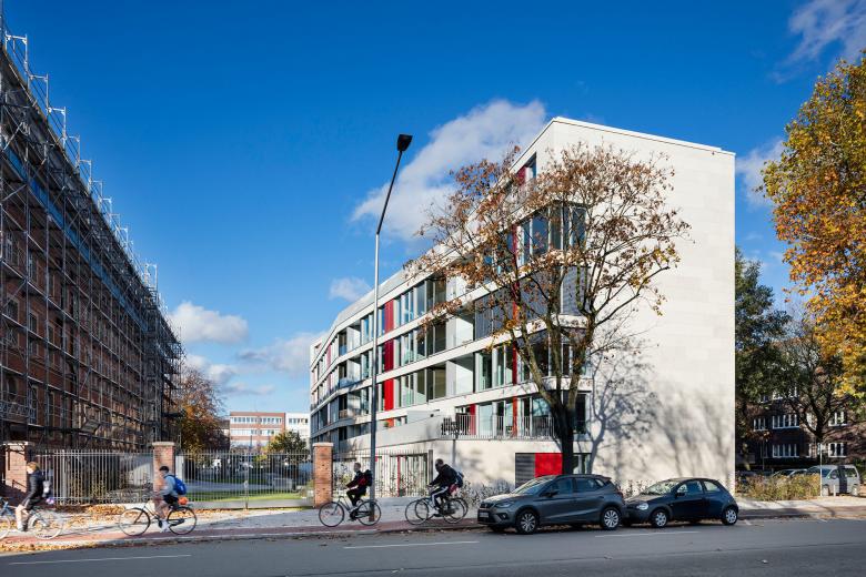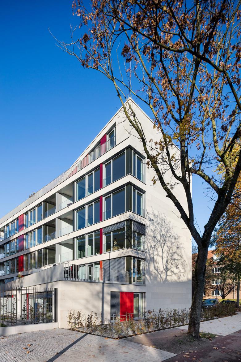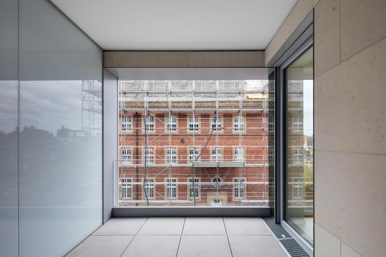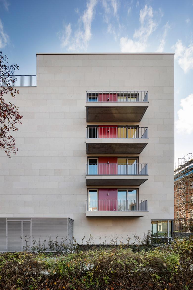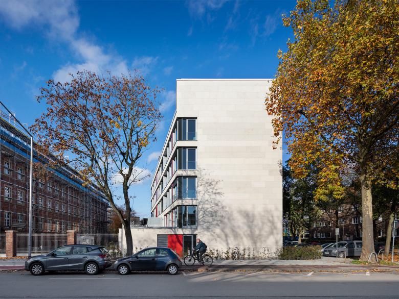 Die Eigenständigkeit des Neubaus wird durch die helle hochwertige Natursteinfassade in Verbindung mit den großflächigen Fensterelementen der Westfassade bestärkt. Die Ostfassade des Neubaus greift hingegen mit den Einzelfenstern die grundsätzliche Fassadenstruktur des Bestandsgebäudes auf. Durch die dezent eingesetzten, farbigen Akzente wird die Farbigkeit des Bestandsgebäudes gespiegelt.