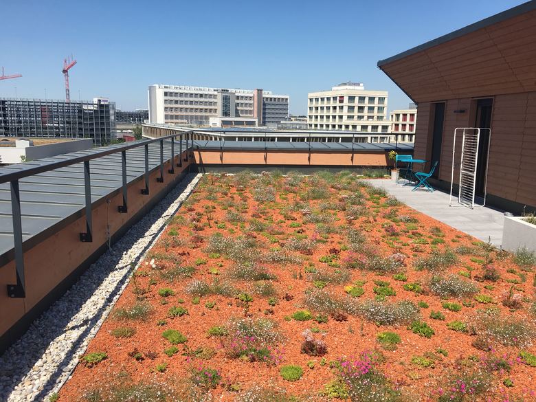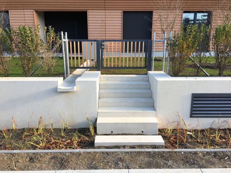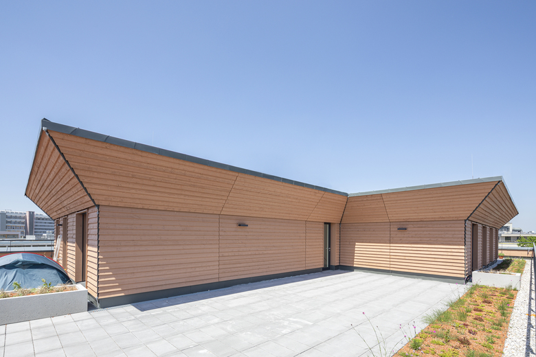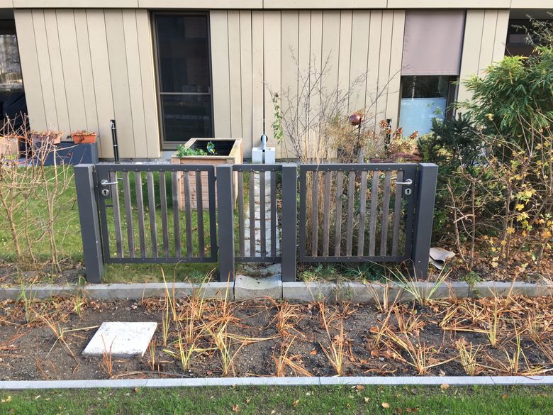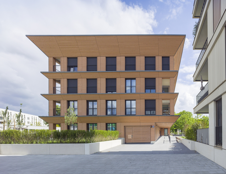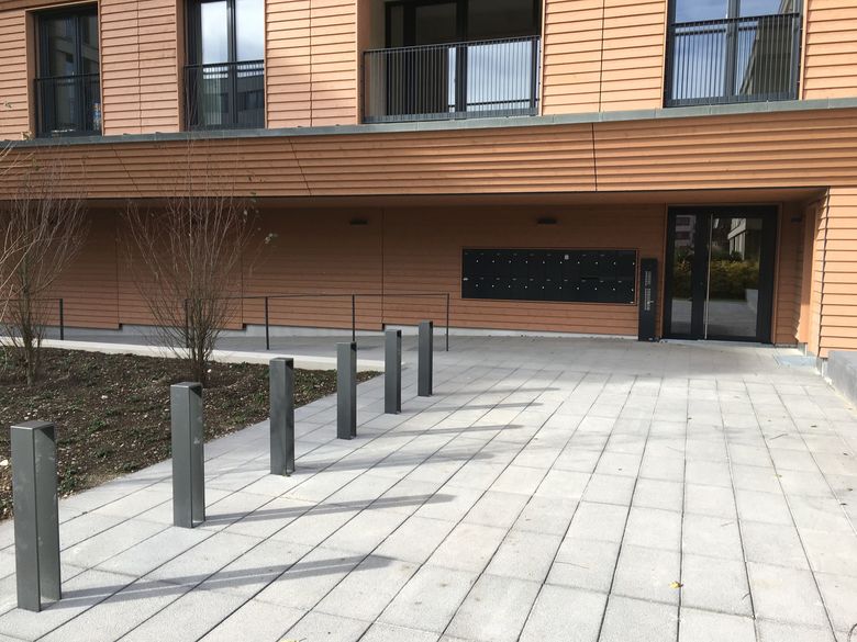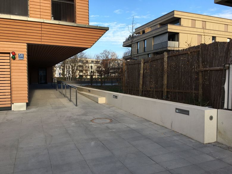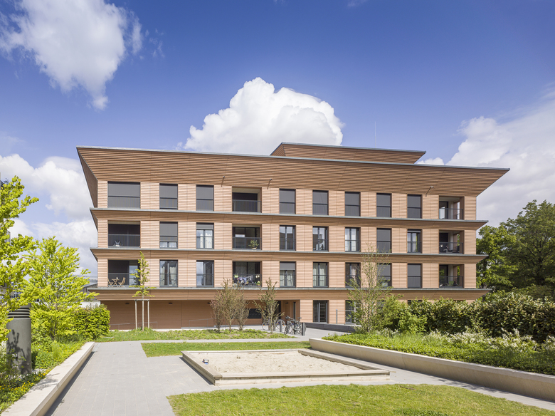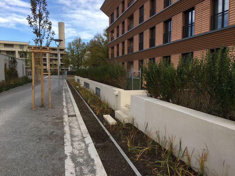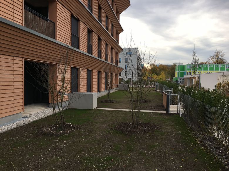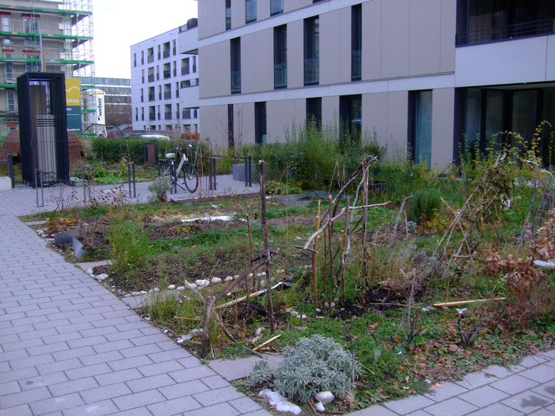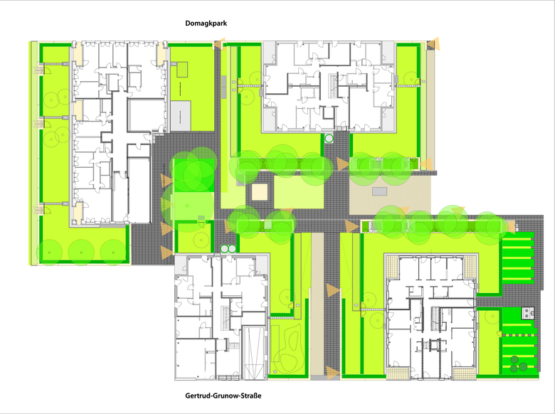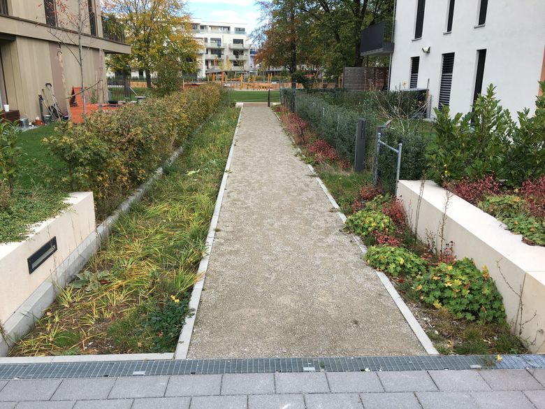 Die vier Geschossbauten am westlichen Ende der Gertrud-Grunow-Straße liegen auf dem Gelände der ehemaligen Domagk-Kasserne (Funkkasserne). Sie wurden in zwei Bauabschnitten realisiert. Bauherren des ersten waren zwei Baugruppen mit insgesamt 40 Mitgliedern, des zweiten die B&O-Gruppe aus Bad Aibling, die Werkswohnungen realisiert hat. Die Baukörper orientieren sich um einen zentralen Anger der durch Sitzmäuerchen von den Erdgeschossgärten abgegrenzt ist. Bei beiden Teilprojekten wird das Dachwasser dezentral in mit Iris bepflanzten Sickermulden versickert. Das System aus Pralltopf bzw. Schöpfbecken, Ableitungsrinne und Mulde ist gleichzeitig ein gestalterisches Element das i.d.R. auch zur Abgrenzung der ebenerdigen Freibereiche untereinander und gegenüber benachbarten Flächen dient. Das östliche Gebäude besitzt im Osten Bewohnergärten ,also kleinteilige Flächen die von den Bewohnern der oberen Geschosse bewirtschaftet werden. Die Wasserzapfstellen hier werden aus einer Zisterne gespeist. Alle Dächer sind extensiv begrünt und z.T. mit Fotovoltaik-Paneelen belegt.