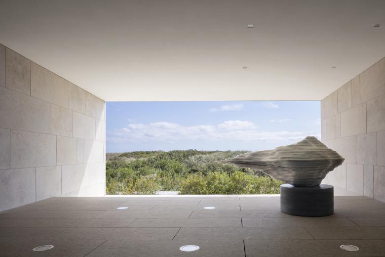 Located in a dune field between the beach and a wetland preserve, this upside-down house emerges from the sand with a rough-hewn stone plinth base and glazed upper floors. To maximize views of the ocean and wetlands, the public living spaces are situated on the upper level while the private areas are nestled in the dunescape on the house’s lower level.