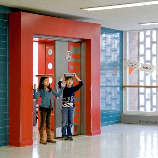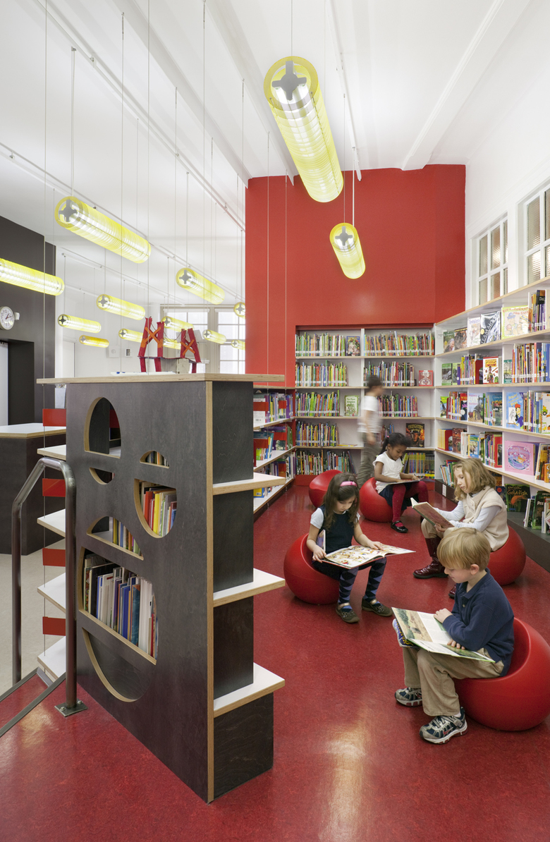 The challenge was to create a visually open environment with distinct functional requirements: quiet reading, computer and study areas, open teaching and group reading areas, as well as book circulation, re-shelving and storage zones. Our goal was also to design a unique and playful environment for the students and the community that suggests both the importance and the joy of reading and learning. We introduced a line of suspended bookshelves the length of the library to set off a ramped amphitheater-like reading area from the quiet zones, perforating the custom shelving system with large circular apertures to maintain the librarians’ lines of sight. The space is further wrapped with a second, built in shelving system, seemingly set into the walls’ thickness. Custom pentagonal tables snake through the space, allowing for flexible reconfigurations to accommodate different class’ requirements. Student workshops were conducted by Hester Street collaborative from which artwork, inspired by books from the library’s new collection was created. The student work, permanently installed in the libraries, is back-lit along one wall to further animate the space.allowing for flexible reconfigurations to accommodate different class’ requirements. Student workshops were conducted by Hester Street collaborative from which artwork, inspired by books from the library’s new collection was created. The student work, permanently installed in the libraries, is back-lit along one wall to further animate the space.