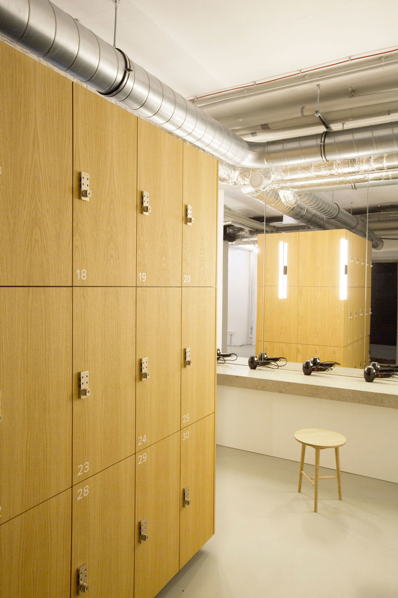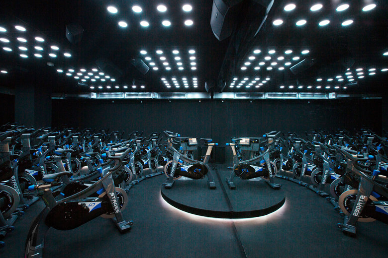 The brass sculpture finally leads to two studios: the Ride Studio, with its energetic club-like atmosphere and exciting light show, and the Yoga Studio, with its relaxing minimalistic aesthetics.
