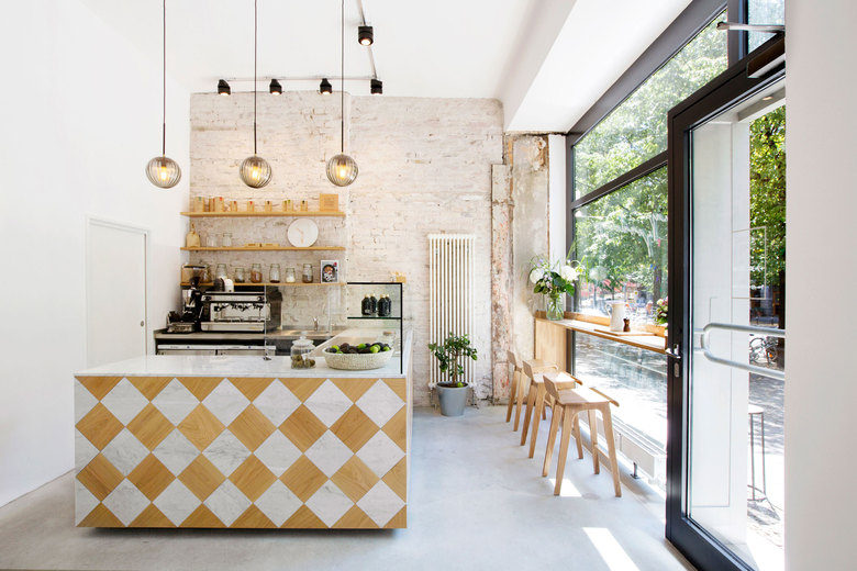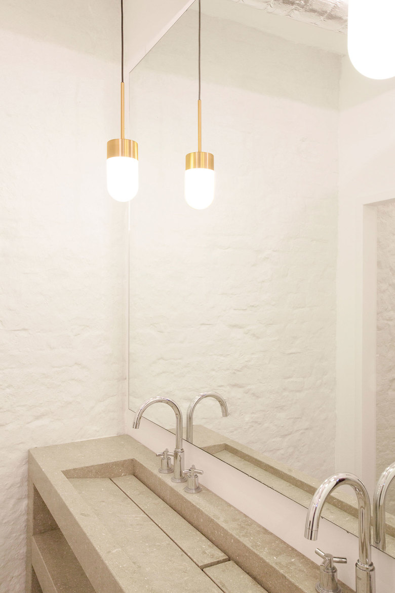 The combination of existing materials like bricks and concrete with new ones like brass, oak and marble, creates a sense of unity throughout the entire interior while defining each room in a unique way.