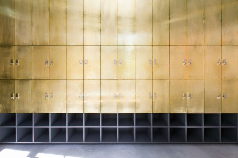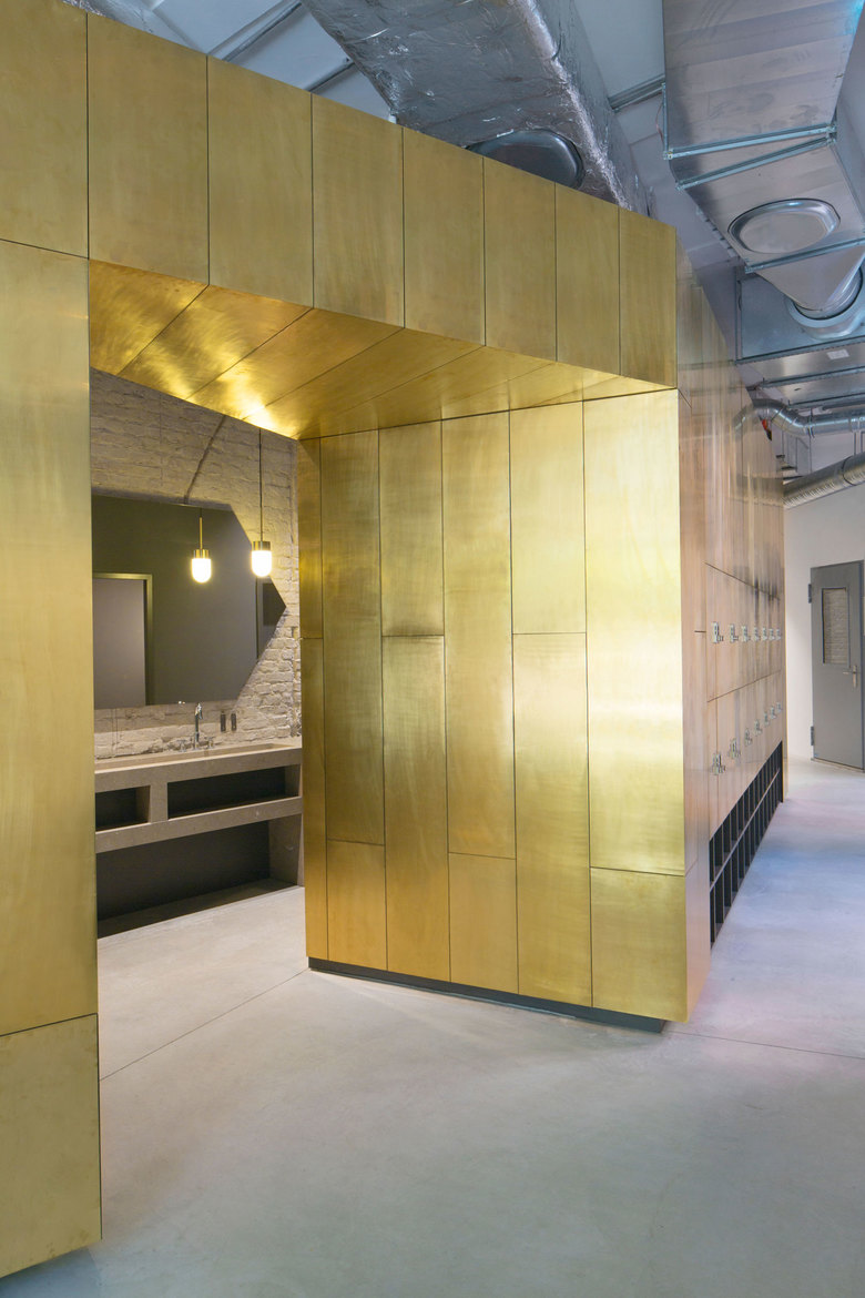 The design reveals the essential elements of the old building while reinventing the space. A hyper-modern brass structure allows the transition from retail area into restrooms and over to the lockers and built-in water fountain. Retail spaces are cut into the metal structure to display fashion and sport accessories.