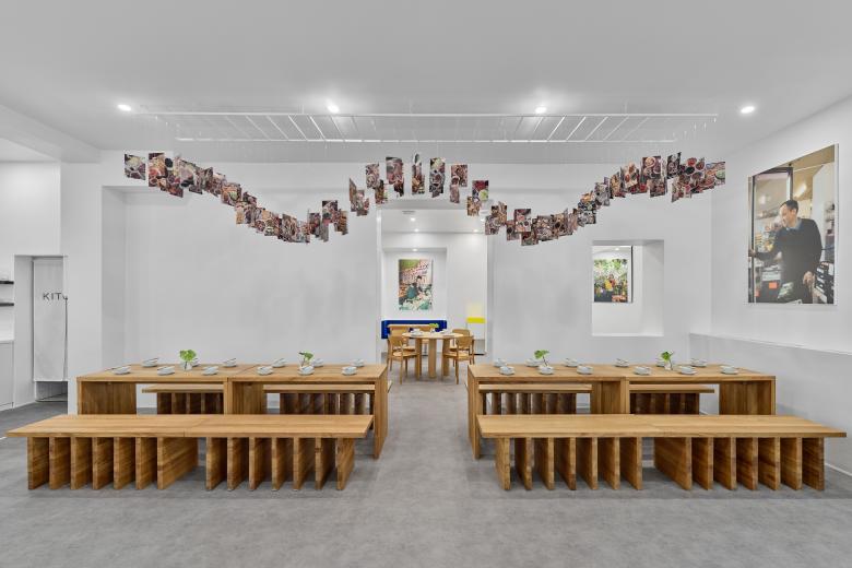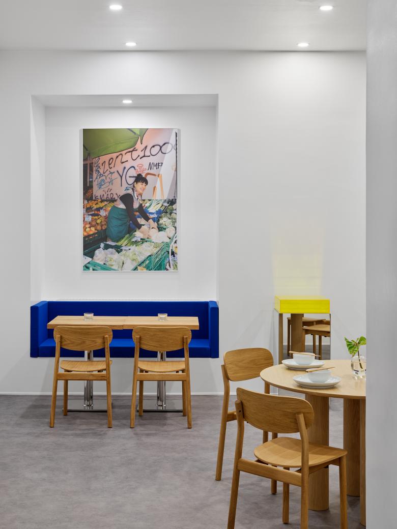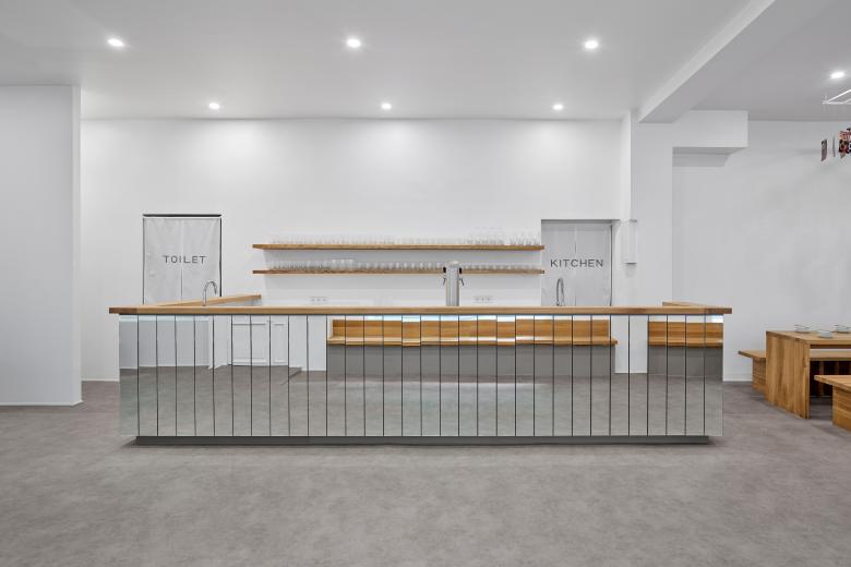 With a clear and minimalist approach, the NHÀN restaurant deliberately avoids Vietnamese folkloric elements. Instead, specially created installations are used in a new and playful context. Typical everyday Vietnamese household items are repurposed and highlighted as decorative elements on showcases. The wavy ceiling installation as a composition from various photographs of traditional Vietnamese dishes provides an insight into Vietnamese food culture. As a sharing concept, the authentically prepared dishes are served as tapas in simple bowls.