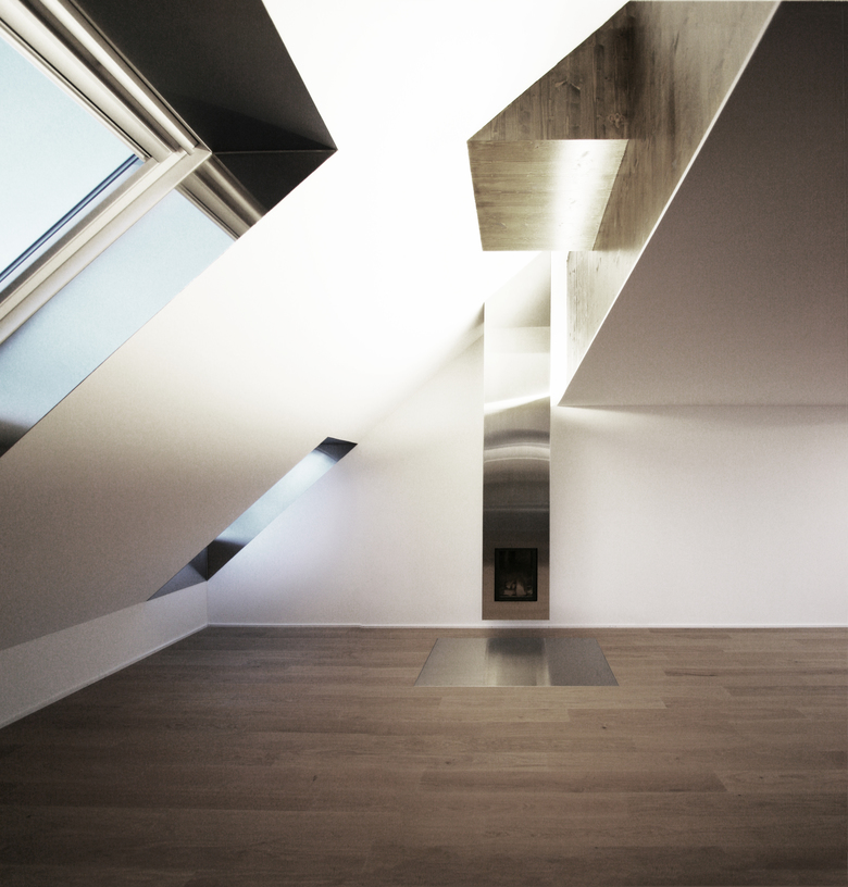 Im Inneren dominieren die drei Materialien, Chrom, lasiertes Fichtenholz und weisser Putz. Das Chrom ist bei den Fensterleibungen, der hängenden Feuerstelle und der Küche zu finden. Das Licht und der Schatten werden von der Umgebung aufgenommen und spiegeln sich in den Leibungen der Dachschrägen. Gleichzeitig kontrastiert die feine und glänzige Oberfläche mit der Textur und Zeichnung des lasierten Konstruktionsholzes. Ein Wechselspiel zwischen fein und rauh, zwischen Moderne und Geborgenheit entsteht.