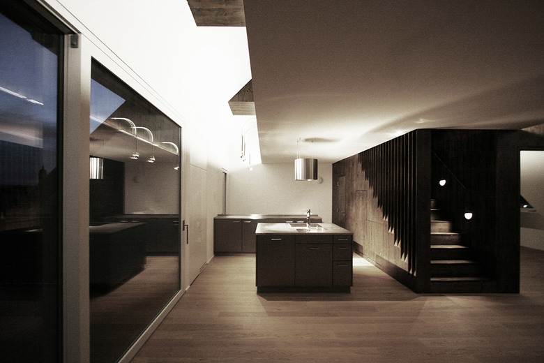 Die Öffnungen sind grosszügig und auf unterschiedlicher Raumhöhe angeordnet. Gezielt suchen Sie Bezugspunkte nach Aussen, schaffen spannungsvolle Sichtbezüge oder unterbinden diese. Die Fenster sind seitlich jeweils bündig und somit visuell Rahmenlos eingelassen. Die Terrasse ist über eine grosszügige Verglasung mit dem Wohnzimmer verbunden. Eine spannungsvolle Atmosphäre, resultierend aus den unterschiedlichen Oberflächen und Raumgeometrien, zeichnet den Entwurf aus.