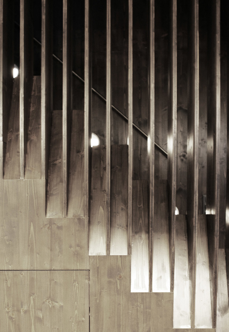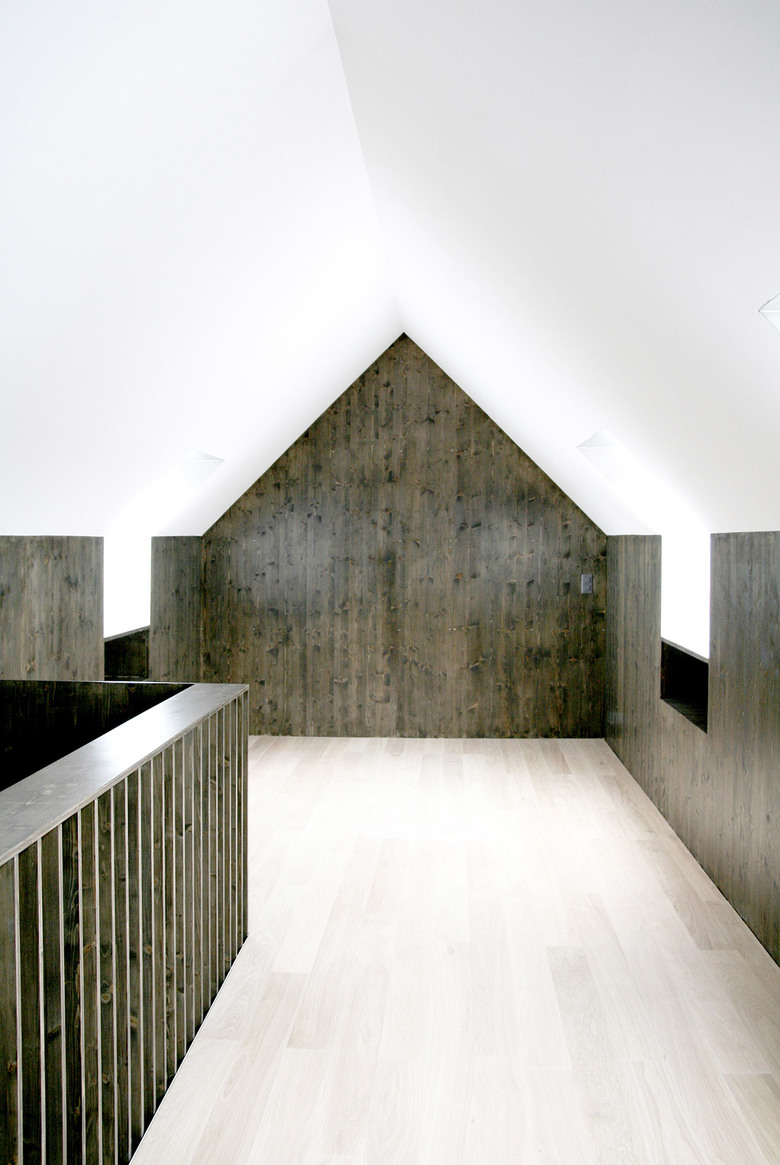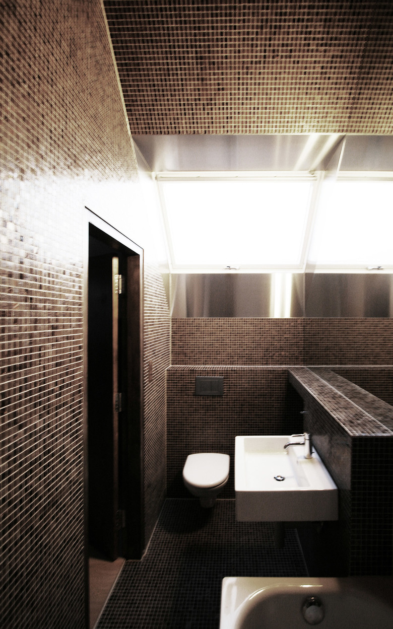 Die neue Dachwohnung ist Resultat einer zweistöckigen Dacherweiterung auf einem Mehrfamilienhaus aus der Gründerzeit. Die Vorfabrikation des Rohbaus in Holz ermöglicht eine kurze Bauzeit. Der neue Aufbau ist zwischen die bestehenden Brandmauern der Nachbarshäuser eingespannt. Das Konstrutionsmaterial findet bewusst Ausdruck im Entwurf. So sind die Holzträger des eingespannten zweiten Geschosses deutlich erkennbar. Sie überspannen den gesamten Wohnraum von Brandmauer zu Brandmauer. Als Resultat ist das untere Geschoss sehr offen und weiträumig konzipiert. Das darüberliegende Geschoss ist als ein Haus im Haus gedacht und dient als Schlafraum mit dazugehörigem Badezimmer. Im Querschnitt wird der Raum bis zu einer begehbaren Höhe von 1.80 m ausgenutzt, die Restfläche der Dachschräge wird dem darunterliegenden Geschoss gutgeschrieben. Der Raum weitet sich nach oben aus, er wirkt offen und lichtdurchflutet. Die aus der Überhöhe resultierenden Durchdringungen für die Fenster sind hier deutlich sichtbar. Die beiden Geschosse werden über eine Holztreppe verbunden, deren ästhetisches Merkmal feine Lamellen sind. Die filigrane Holzstruktur ermöglicht Durchblicke und Tiefe.